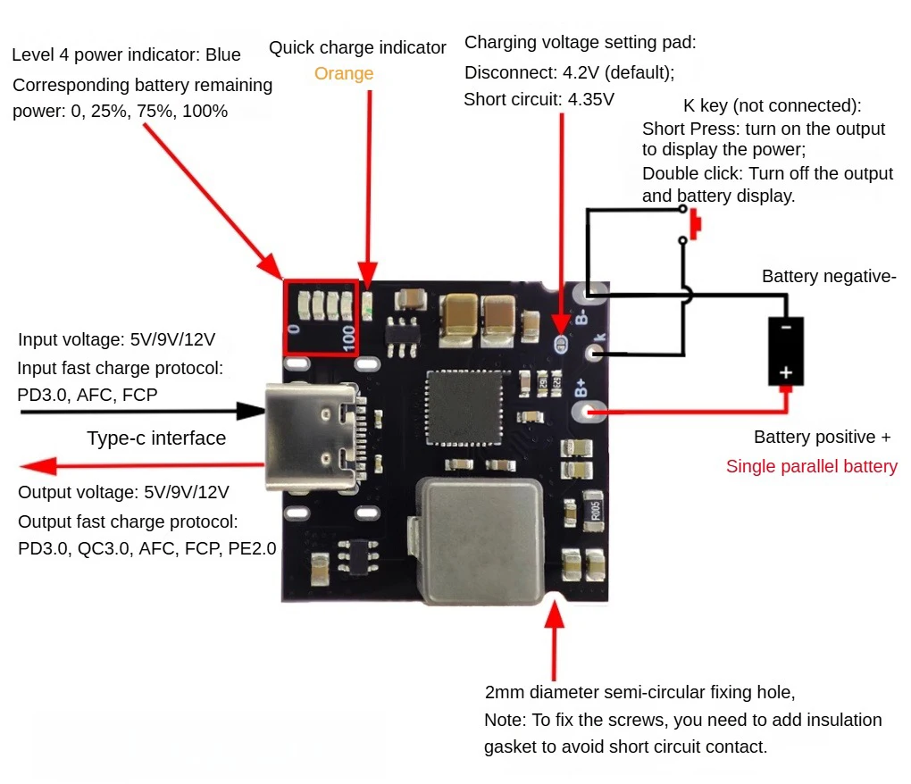 3.Corriente de carga de la batería: activa la carga rápida con un máximo de 4 A (el cable de conexión entre la batería y el módulo debe ser lo más corto y grueso posible) (la placa de protección de la batería puede equiparse o no, asegurando al menos una salida de corriente de 4 A )