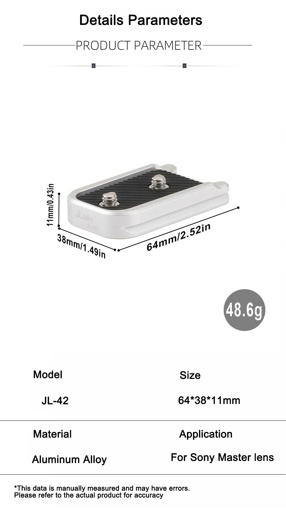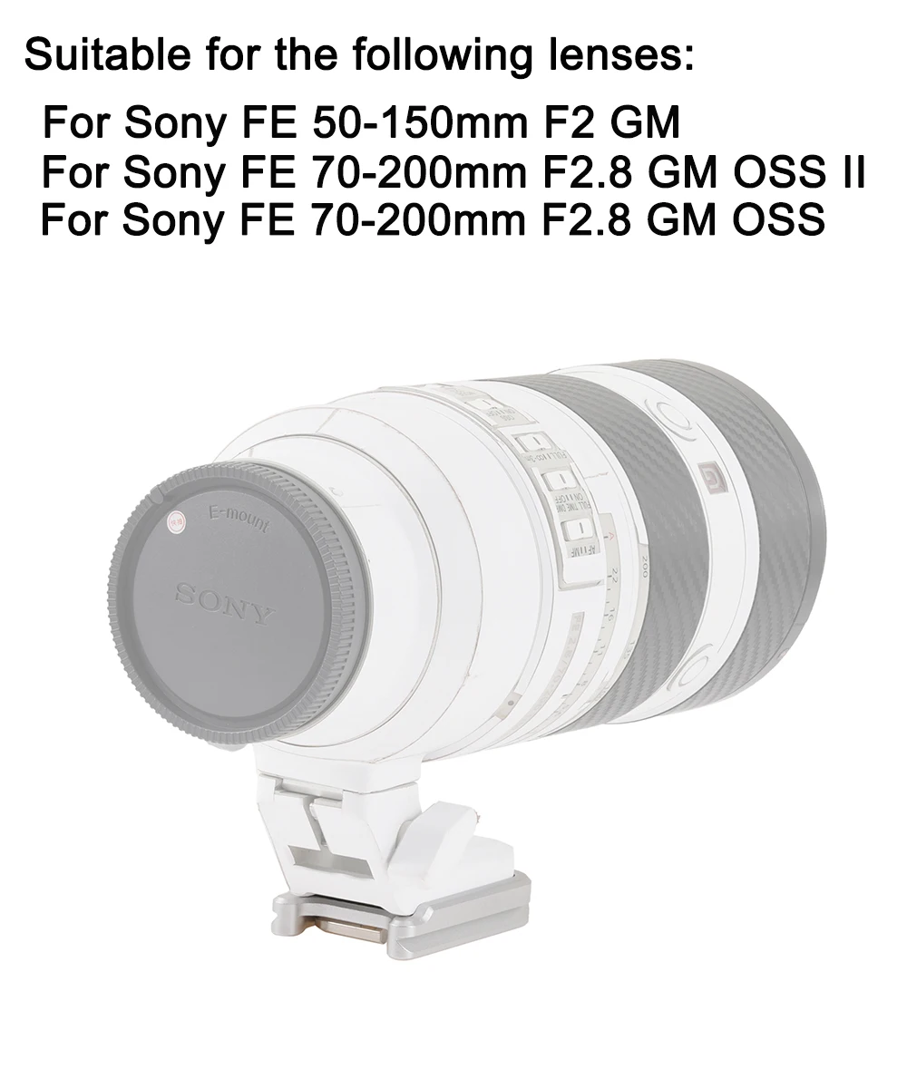 Descripción:El anillo de montaje en trípode en el trípode le ayuda a fijar y equilibrar su teleobjetivo, que es un objetivo pesado o largo cuelga de la parte frontal de la cámara.Peso correcto y construcción fuerte por parte de un tercero.Especificaciones:Fabricado en metal con alta calidad.El UNC (hilo grueso nacional unificado) es 1/4"Color: negroPeso: 48,6 gCompatible:Para asiento de conversión para lente principal Sony Para Sony FE 50-150mm F2 GM Para Sony FE 70-200mm F2.8 GM OSS II Para Sony FE 70-200mm F2.8 GM OSSEl paquete incluye:1 * para asiento de conversión Apta de lente principal Sony