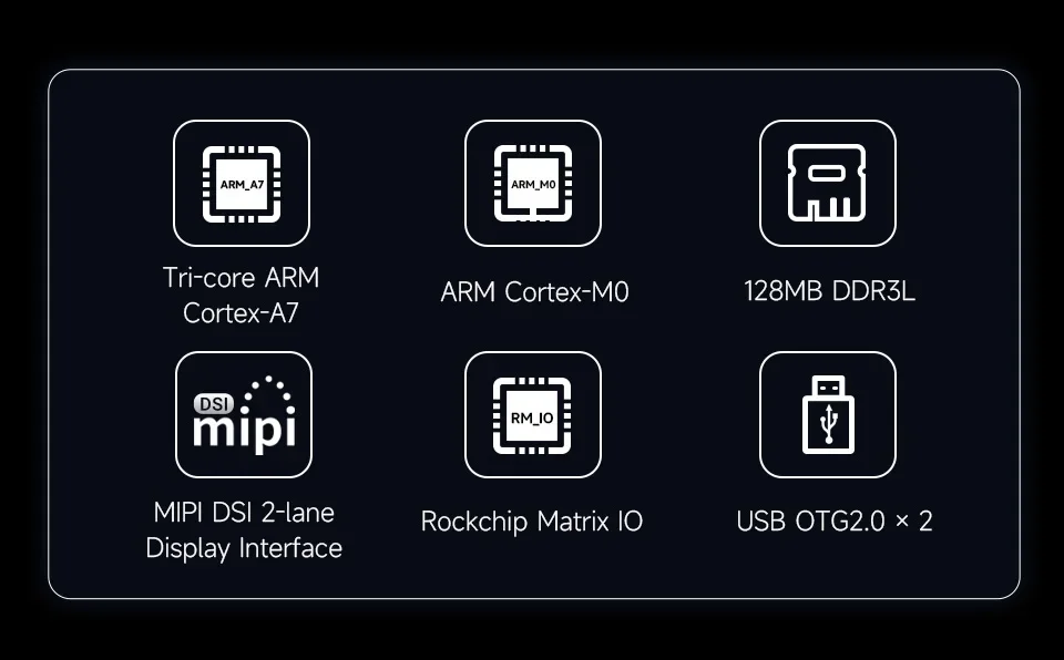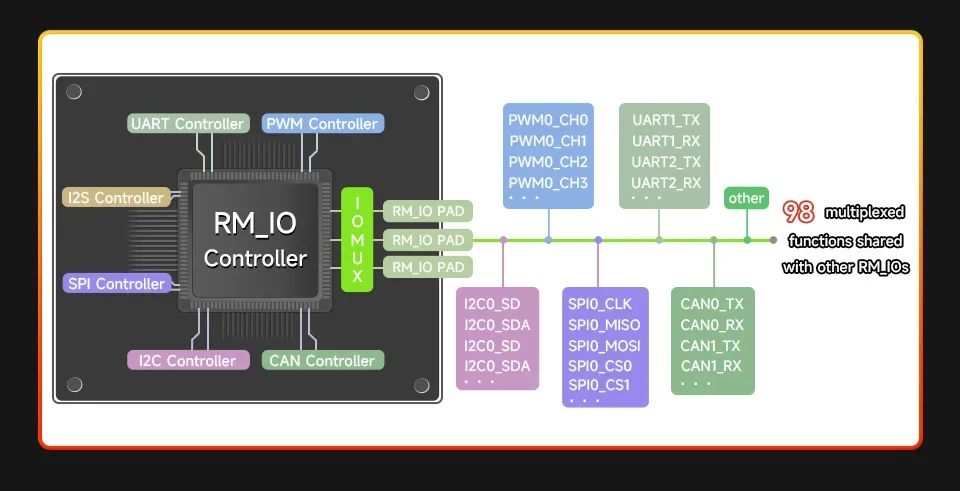 CPU heterogénea multinúcleo, compatible con la pantalla Raspberry Pi DSI, soporte RM_IO (multiplexación PWM, UART, I2C, SPI, CAN y otras señales de funciones), ADC, interfaz RMII reservada, etc.