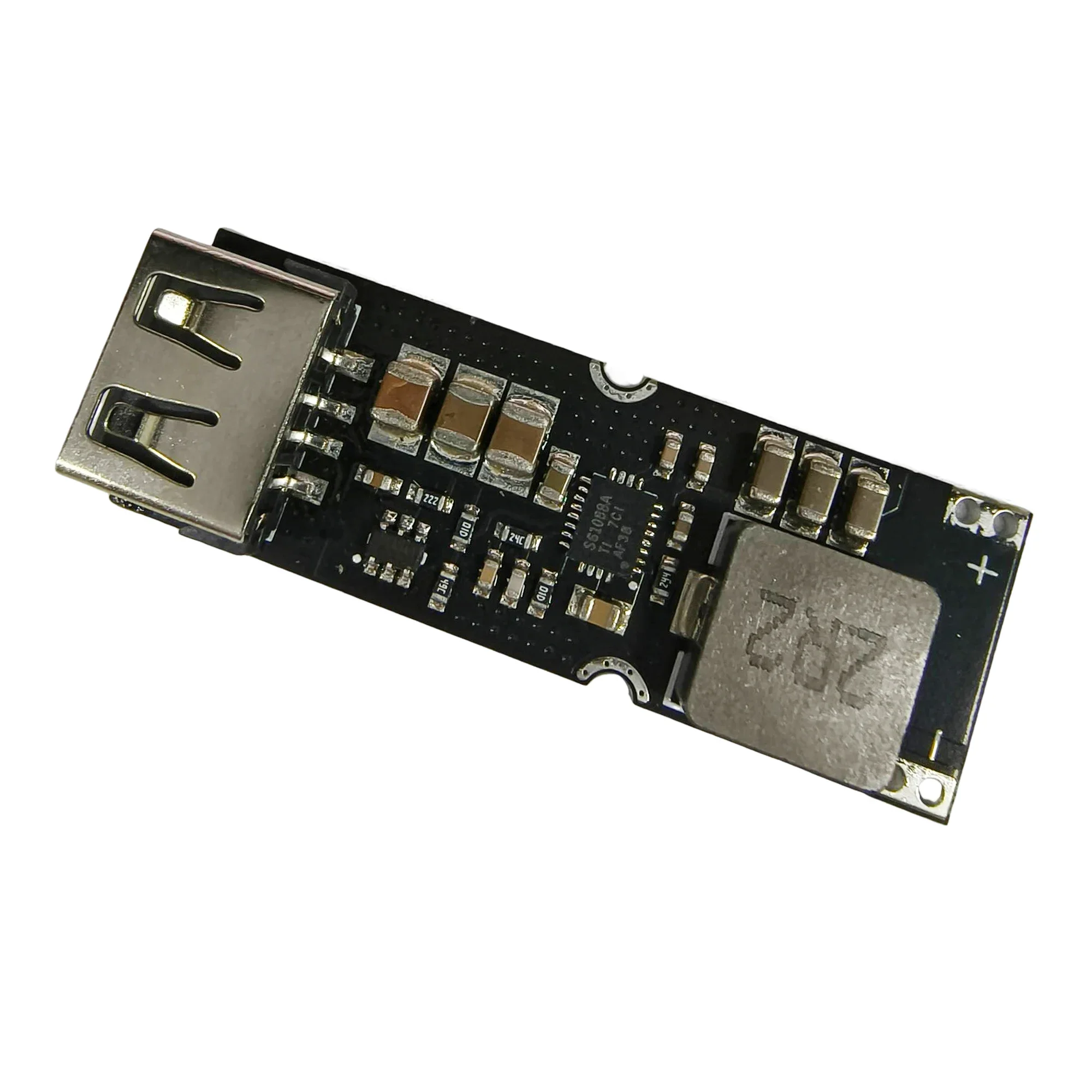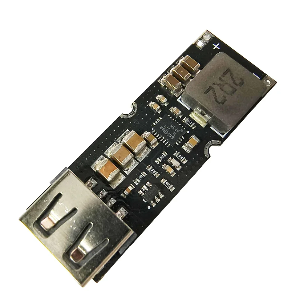 Name: single lithium battery boost fast charging power module Main control chip: TPS61088A Identification chip: FP6601Q Input voltage: 2.8~4.5V, ideal for 3.7V lithium polymer batteries Output voltage: 5V by default, between 4.5V~12V according to the protocol after fast charging is triggered. Input rated current: 8A Output current: 5V3A, 9V2A, 12V2A. output current is adaptive. Output power: 24W. Support protocols: QC2.0, QC3.0, Huawei FCP, DCP protocols Efficiency up to 93%, 90% typical. Input wiring method: solder wire, use thick wire as much as possible Module size: 47.5(L)*16.5(W)*8(H)mm (including USB) Module net weight: about 7 grams