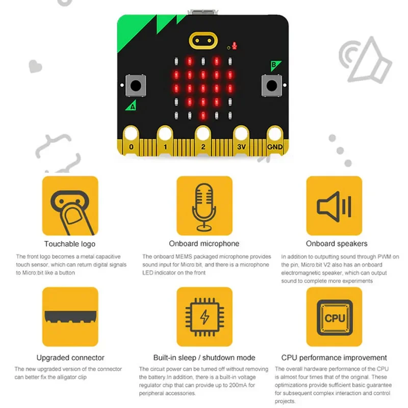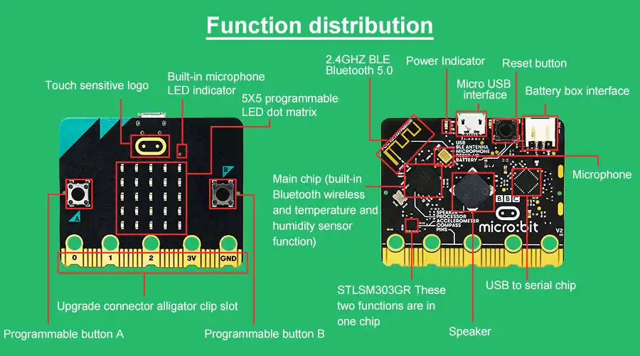 La última placa Micro:bit V2 viene con un logotipo táctil y un micrófono MEMS en la parte frontal.Se agrega un altavoz en la parte posterior, por lo que se pueden reproducir todo tipo de sonidos sin equipo externo.El dedo dorado en la parte inferior agrega un diseño de engranaje para facilitar al usuario la fijación mejor de la pinza de cocodrilo.Además, la placa Micro:bit de segunda generación también admite el modo de suspensión.Los usuarios pueden hacer que entre en modo de suspensión presionando prolongadamente el botón de reinicio, lo que puede reducir el consumo de energía.La característica más importante es que el rendimiento de la CPU de la placa Micro:bit V2 es mucho mejor que el de la versión V1, junto con más RAM.Por lo tanto, Micro:bit V2 permite a los usuarios ampliar más funciones y crear trabajos más creativos.