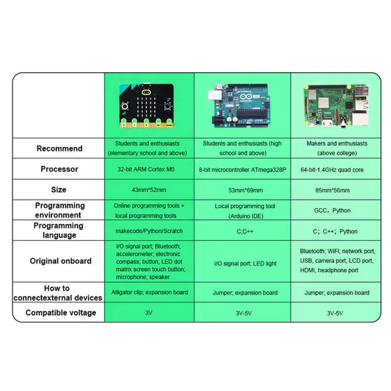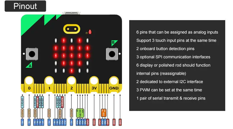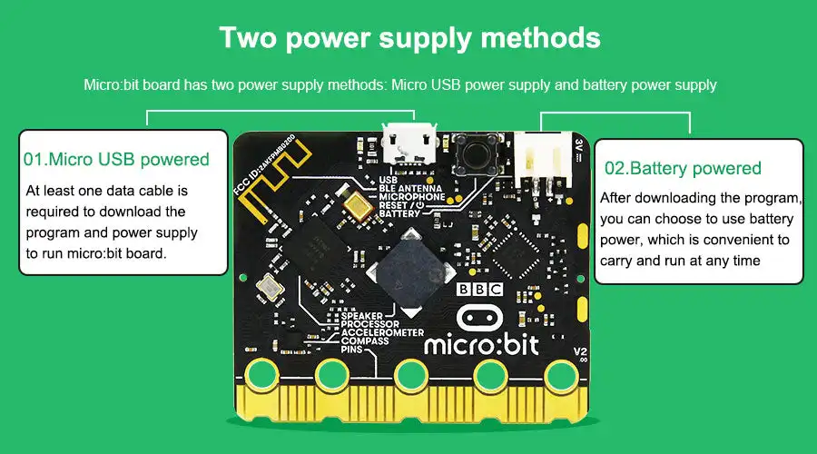 La placa Micro:bit está diseñada por BBC, cuyo objetivo es ayudar a los niños de los 7 grados o más a aprender mejor a programar.La placa Micro:bit tiene abundantes recursos de placa, que incluyen una matriz de puntos métricos de 5*5 LED, 2 botones programables, brújula, puertos USB, módulo Bluetooth, etc.Es sólo de bolsillo pero muy potente.También puedes programarlo, personalizarlo o controlarlo.