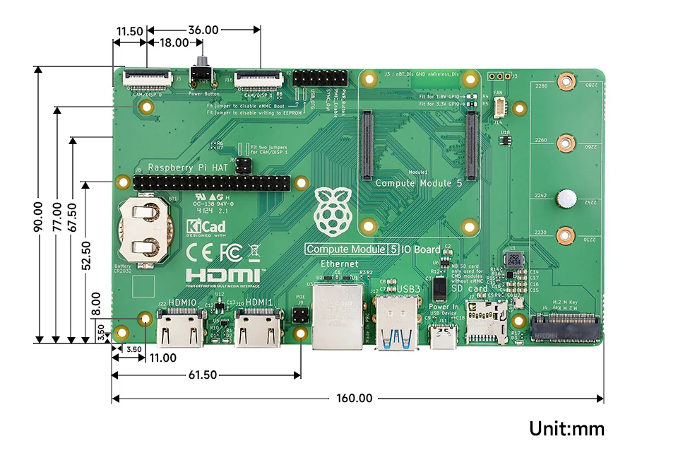 The Compute Module 5 IO Board is a companion board for Raspberry Pi Compute Module 5 (supplied separately). It is designed for use both as a development system for Compute Module 5 and as an embedded board integrated into end products.