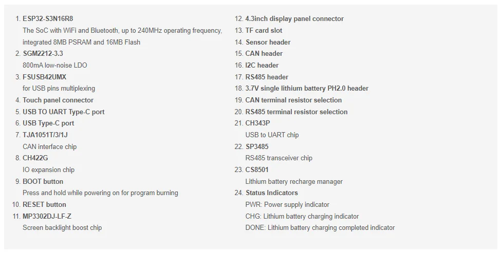 Este producto es una placa de desarrollo de microcontrolador con WiFi de 2,4 GHz y soporte BLE 5, integra Flash y PSRAM de alta capacidad.La pantalla LCD integrada de 4,3 pulgadas puede ejecutar sin problemas programas GUI como LVGL.Combinado con varias interfaces periféricas, adecuado para el rápido desarrollo de HMI y otras aplicaciones ESP32-S3
