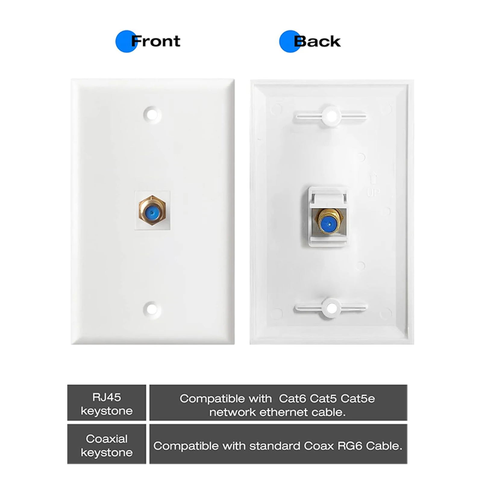 Placa de pared de 1 puerto: placa de pared + conector Keystone Coax + 2 tornillos.(No incluido soporte de montaje de bajo voltaje).