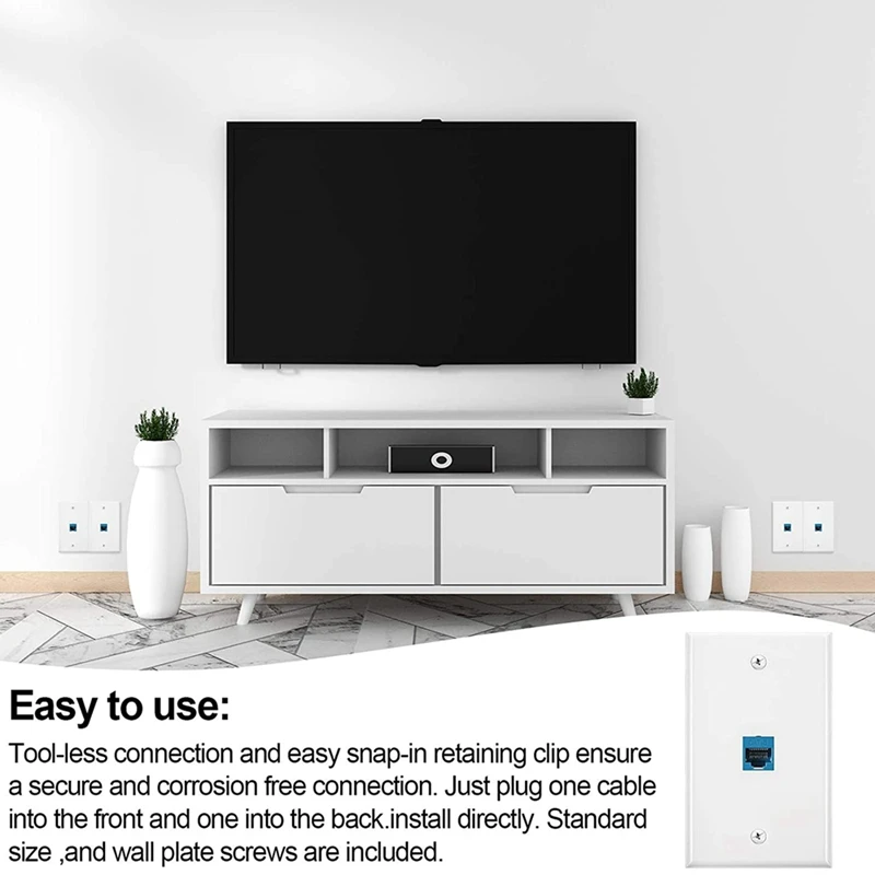 La placa de pared Ethernet Cat6 de 1 puerto no tiene conexión de herramientas. El accesorio de clip simple garantiza que la conexión sea segura y libre de corrosión.Simplemente conecte un cable en la parte delantera y otro en la parte posterior para extender su cable.
