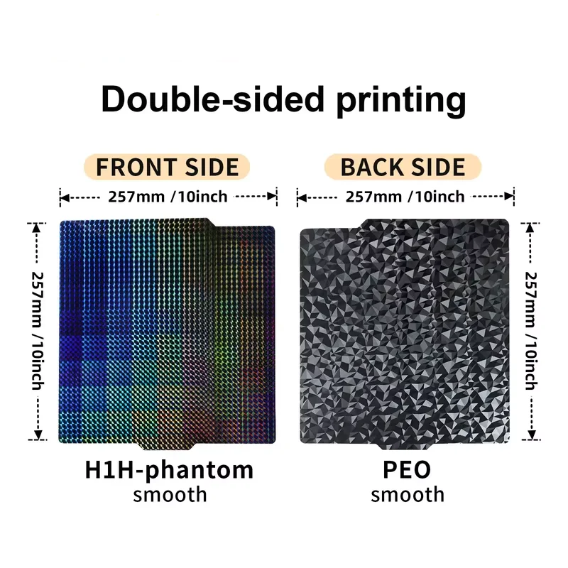 Tamaño: 257x257mmAdecuado para Bambu lab X1, X1C, P1P, P1S,A1Estilo:PEY: PEI texturizado + PEY lisoPEO: PEI texturizado + PEO lisoPET: PEI texturizado + PET lisoPEI: PEI texturizado + PEI suavePEI: PEI texturizado de doble caraH1H: H1H suave de doble cara