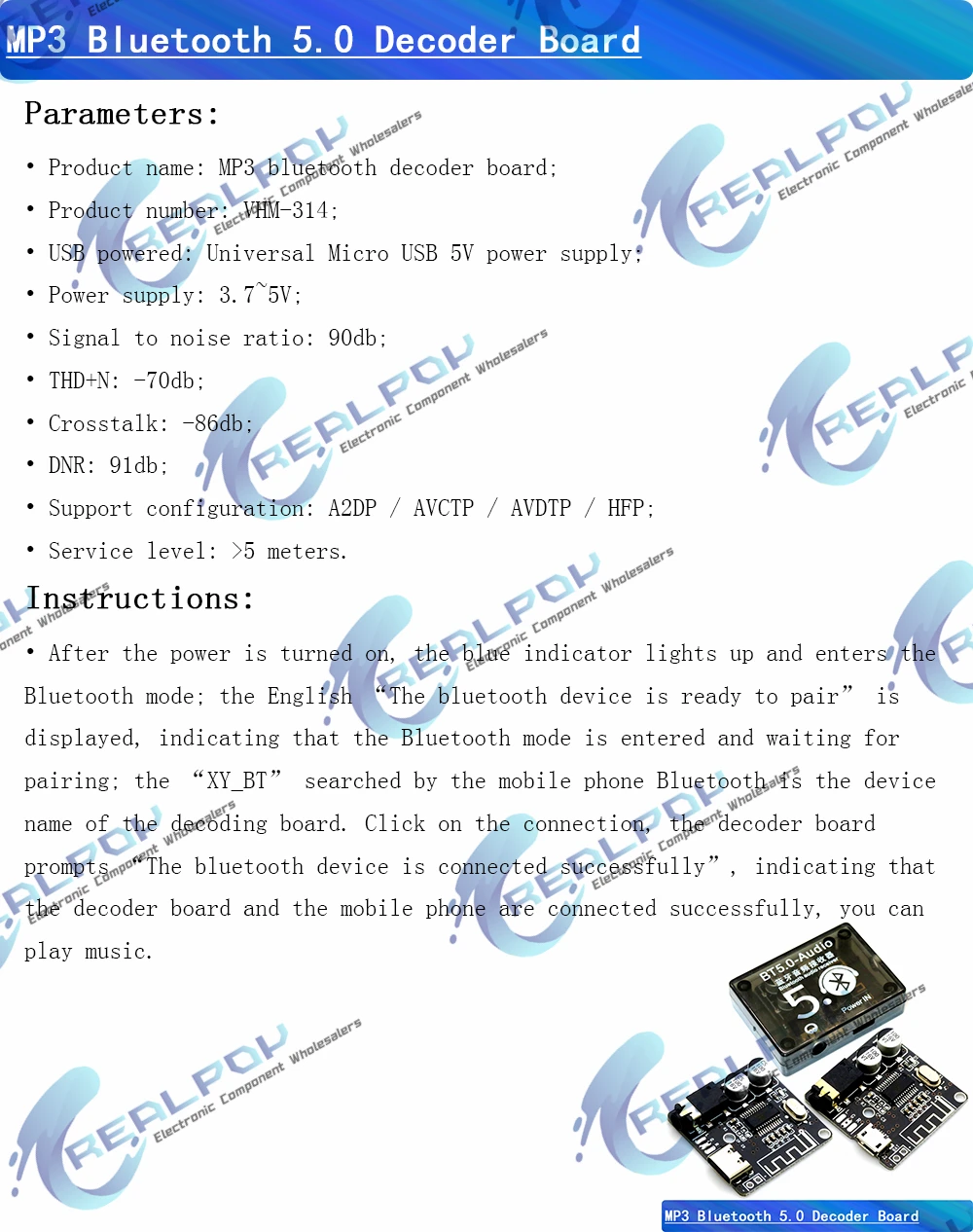 Recibí el producto. Conectado a una fuente de alimentación de 5 V mediante un cable USB-C a mi computadora portátil. No pasó nada y no había luces en el tablero. Conectado a unos auriculares y escuché un ruido estático. La placa se estaba calentando mucho, así que la desconecté. Lo intenté varias veces pero sin éxito y cada vez el chip integrado estaba extremadamente caliente y a punto de quemarse. El apoyo no fue útil. Seguían enviándome las mismas instrucciones en línea sobre cómo emparejar el dispositivo. Pérdida de tiempo y dinero. Nunca volveré a comprarle a este proveedor.