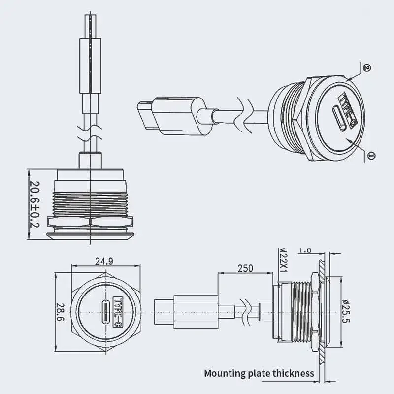Placa de roscado hembra a macho de TYPE-C, Cable de extensión, enchufe de interfaz con Cable, enchufe de 24 pines, línea de transmisión de datos tipo C
