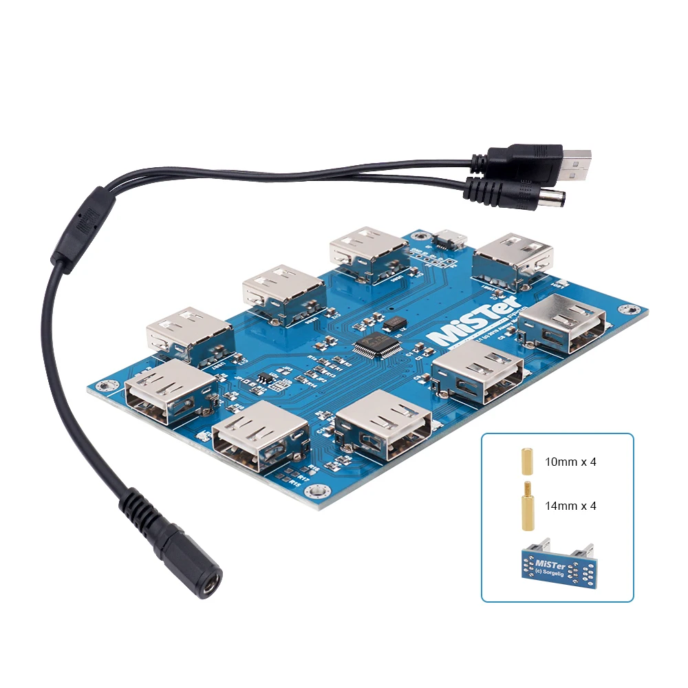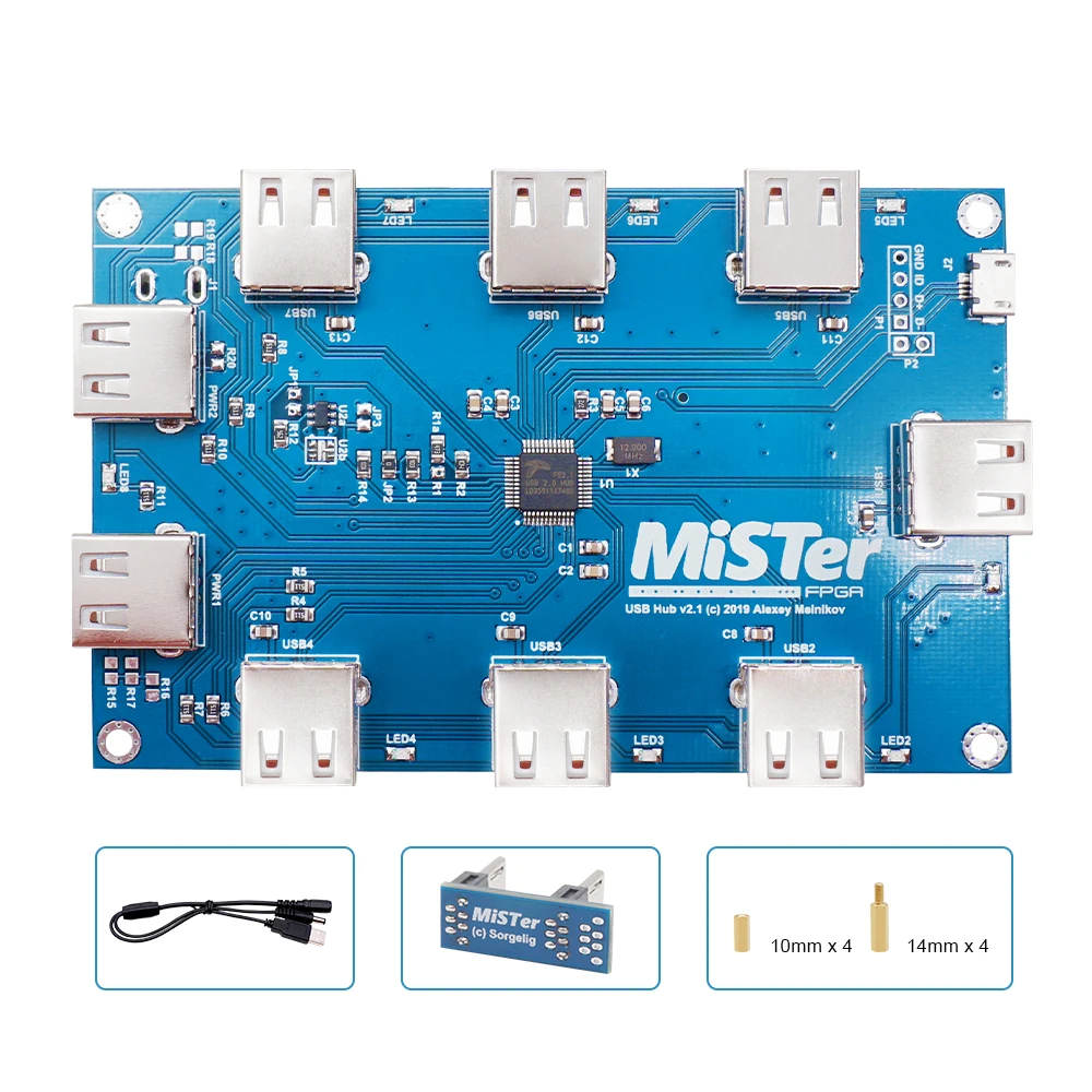 Este es un Hub USB adicional opcional para conexiones de dispositivos USB convenientes. Con esta placa, el MiSTer tiene siete puertos USB adicionales que se ajustan perfectamente al chasis existente. El puente USB se conecta sin problemas a la placa DE10-Nano SoC sin cables adicionales.