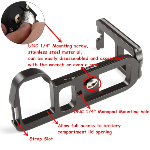 Introducción:Características:1.L Placa diseñada personalizada para la cámara Sony A7 II, combinación perfecta para el cuerpo de la cámara, no se balancea ni se gira cuando se monta en el soporte.2. Clavos de milano estándar Arca-Swiss, tanto la placa base como la placa vertical son 100% compatibles con la abrazadera de liberación de palanca RRS.3. Presenta un diseño desmontable, la placa base y la placa vertical se pueden desmontar y ensamblar fácilmente para adaptarse a diferentes experiencias de disparo.4. No afectará la apertura de la tapa del compartimiento de la batería de la cámara ni la apertura de la escotilla de los cables de datos.5.Permitir acceso completo a la pantalla abatible6. La placa base tiene un orificio de montaje roscado adicional de 1/4''-20 reservado para funciones adicionales.7.Aluminio 6061T6 de nivel de aviación liviano, mecanizado mediante CNC de precisión y superficie procesada con tratamiento de oxidación anodizado duro.8.Superficie muy lisa, resistente a los arañazos.Especificaciones:Modelo: LB-A7M2Adecuado para Sony A7 IIMaterial: AluminioOrificio de montaje: 1/4" 20 UNCPeso: 108 gCompatibilidad:Colas de milano Starndard Arca-Swiss, compatibles con marcas Arca Swiss, RRS, kirk, Wimberley, Markins, Sunwayfoto, Benro, Suri, Fotopro... con AS standardard.El paquete incluye:1x soporte en L LB-A7M2 para Sony A7 II1x llave