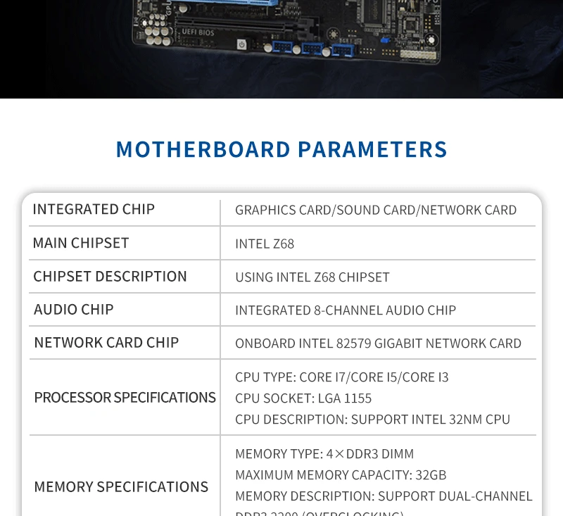 Chip placa baseTarjeta gráfica con chip integrado/tarjeta de sonido/tarjeta de redChipset principal Intel Z68Descripción del chipset Uso del chipset Intel Z68Chip de audio integrado chip de audio de 8 canalesChip de tarjeta de red integrado Intel 82579 Gigabit tarjeta de redEspecificaciones del procesadorCPU tipo Core i7/Core i5/Core I3 // Pentium/CeleronToma CPU LGA 1155Descripción DE LA CPU Compatible con procesador Intel de 22nmEspecificaciones de memoriaTipo de memoria 4 × DDR3 DIMMCapacidad máxima de memoria 32GBDescripción DE LA MEMORIA Admite memoria de doble canal DDR3 2200 (overclocking) MHzExpansión de almacenamientoPCI-E estándar PCI-E 3,0 estándarRanura PCI-E 3 × X16 ranura para tarjeta gráfica, 2 × 1 ranura para 1/2x1/2Ranura PCI 2 × ranura PCIInterfaz de almacenamiento Interfaz 4×SATA II; Interfaz 2×SATA IIIInterfaz I/OInterfaz USB 12 × interfaz USB2.0; interfaz 4 × USB3.0Interfaz de vídeo 1 × interfaz DVI, 1 × interfaz VGA, 1 × interfaz HDMIConector de alimentación Un conector de alimentación de 8 pines, un conector de alimentación de 24 pinesOtras interfaces 1 × interfaz de red RJ451 × interfaz eSATA1 × interfaz de fibraPuerto audioOtros parámetrosFunción de Overclocking Admite tecnología de Overclocking gratuita, admite overclocking inteligente de una tecla