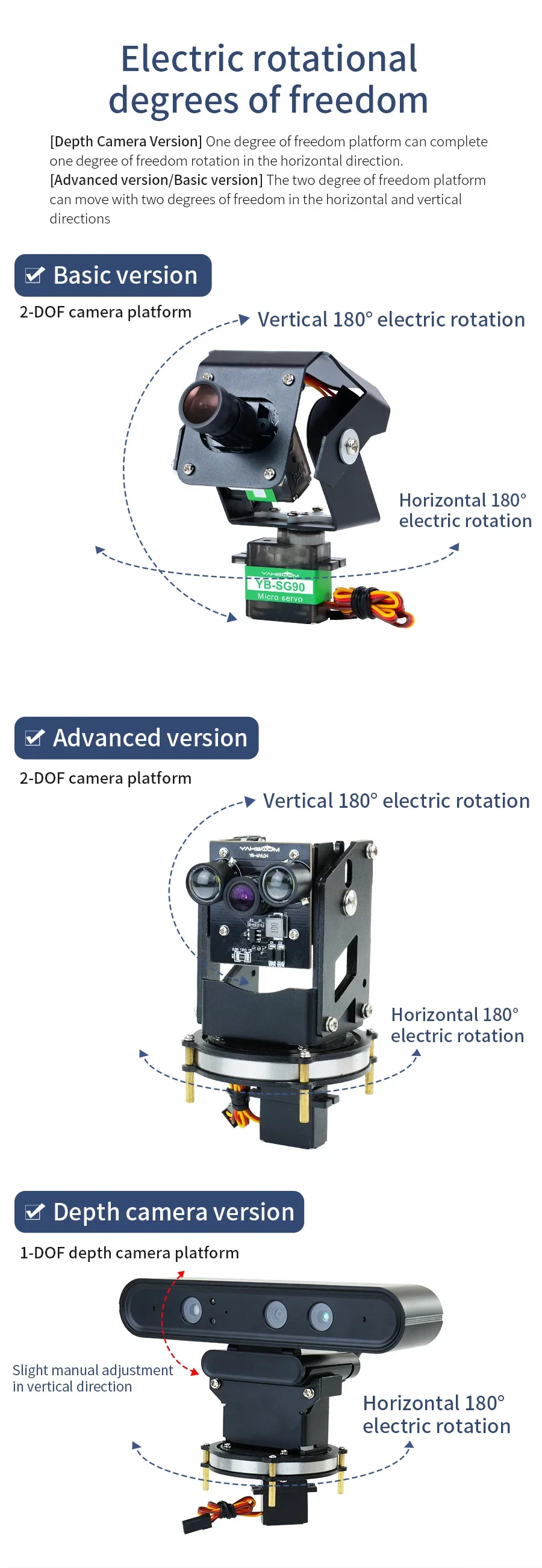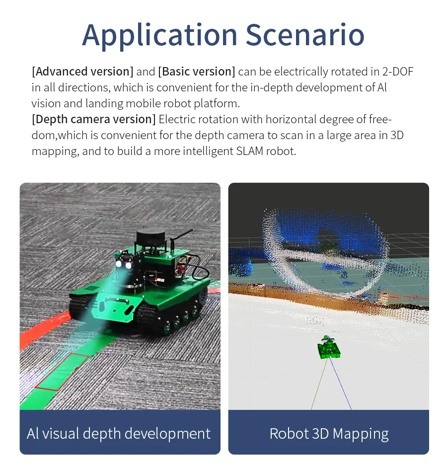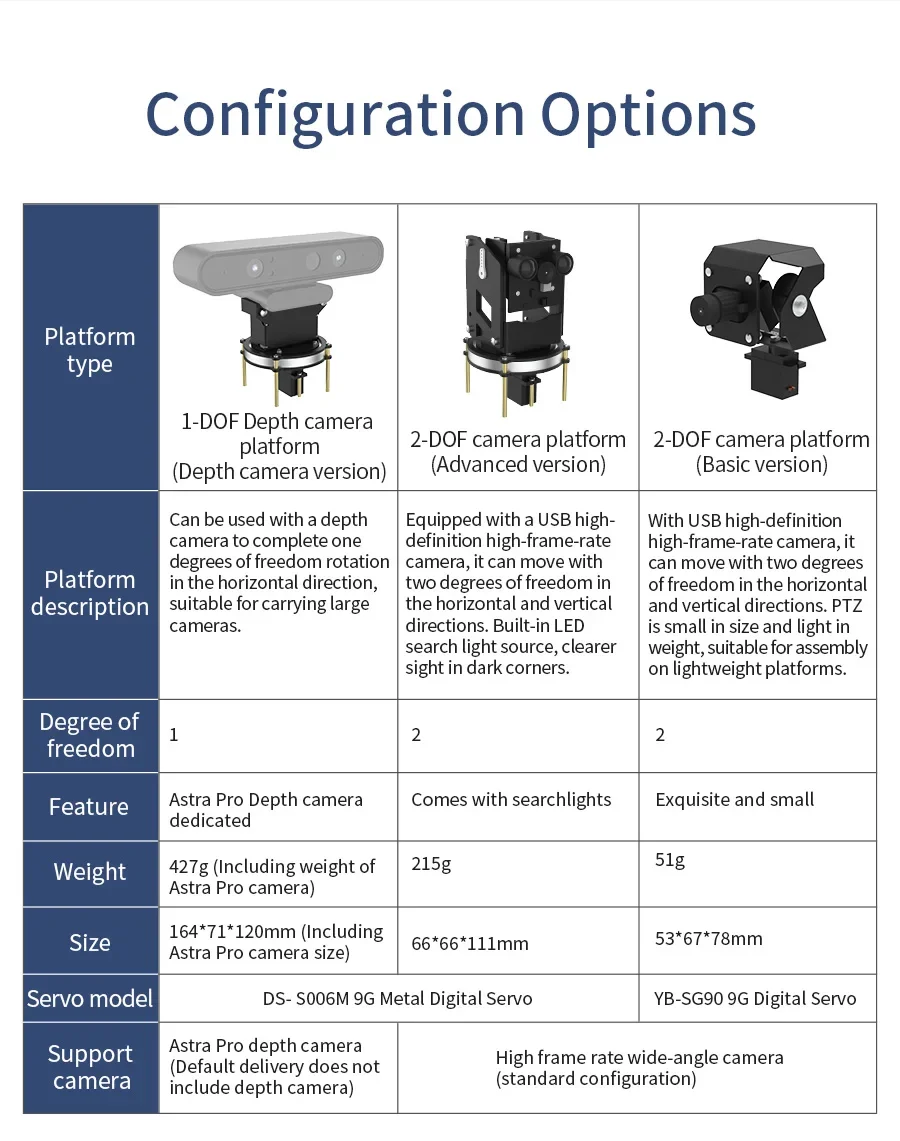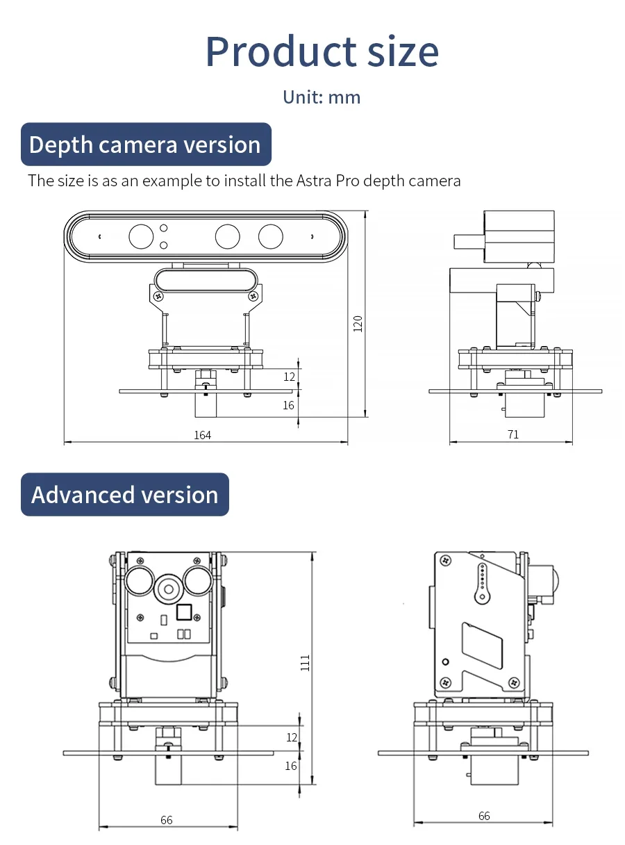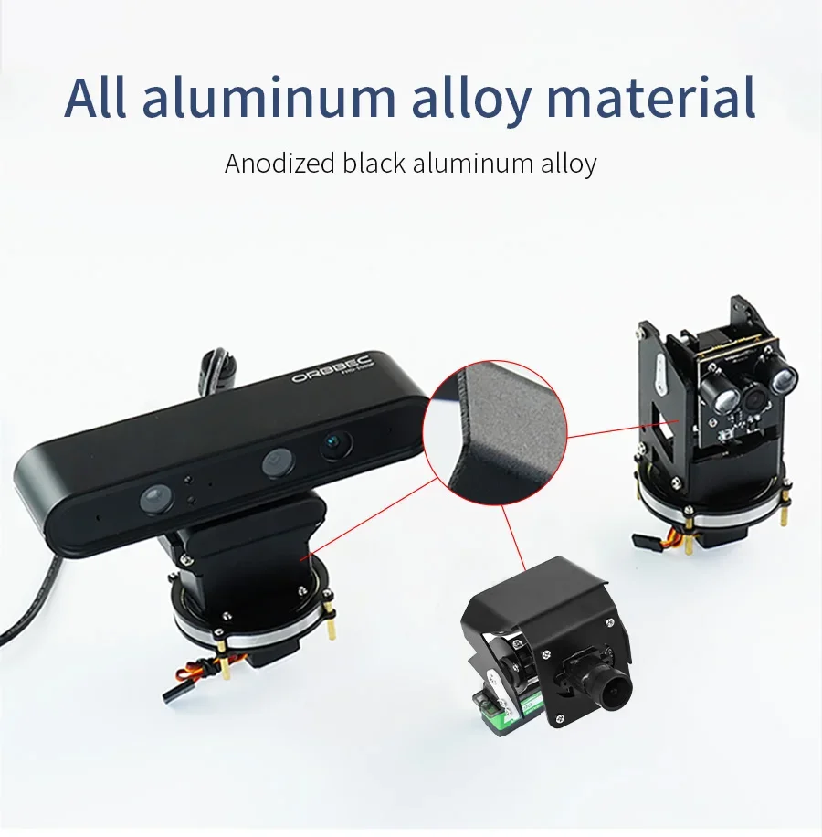 Un grado de libertad, la dirección horizontal se puede girar 0-180°, y la dirección vertical sólo se puede ajustar ligeramente manualmente.Especialmente diseñado para la cámara de profundidad Astra Pro.
