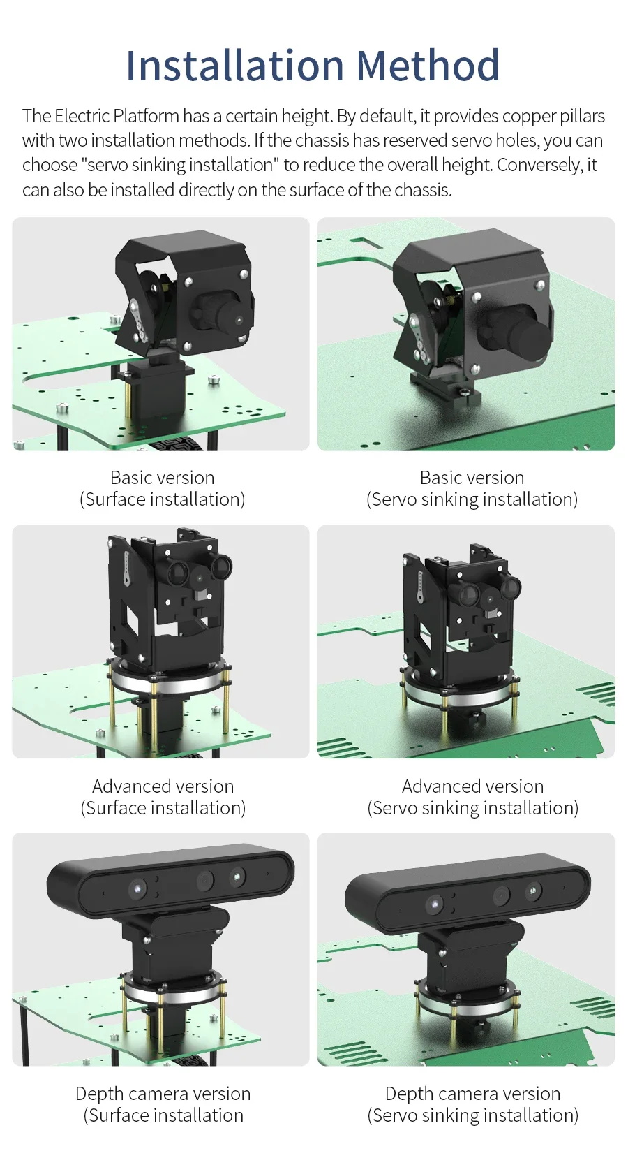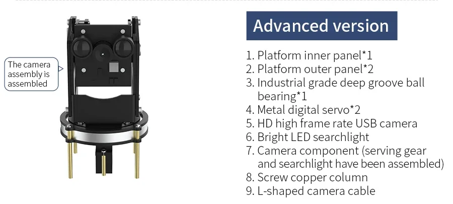 Esta colección incluye tres tipos de plataforma de cámara, todas hechas de aleación de aluminio y mecanismo de dirección digital de metal 9G.Se reservan orificios adecuados para soportar la instalación de tornillos y columnas de cobre, que se pueden utilizar en el automóvil inteligente para conducción automática y reconocimiento visual.