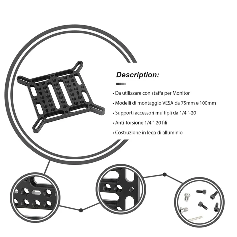 For Use with Monitor Bracket 75mm and 100mm VESA Mounting Patterns Multiple 1/4inch-20 Accessory Mounts Anti-Twist 1/4inch-20 Threads Use this VESA adapter plate for mounting VESA compliant monitors to your monitor mounts. The plate has 75mm and 100mm VESA patterns and includes two different sizes of mounting screws for compatibility with a variety of monitors.