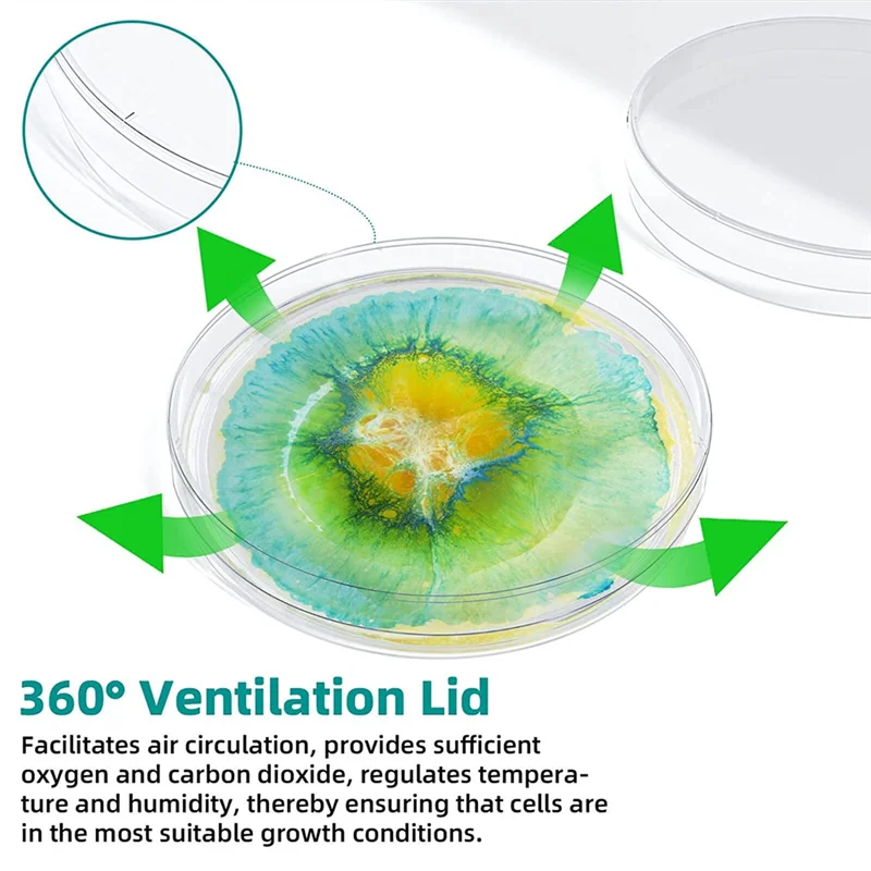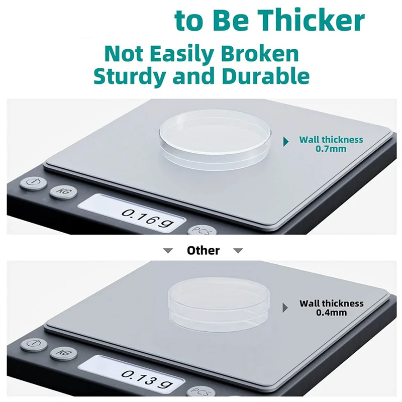 Nuestras placas de Petri pesan 16 gramos, son más gruesas y duraderas; con placas de Petri con tapa de agarre fuerte y muy transparentes, fondo plano y liso, sin distorsión.
