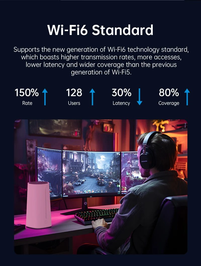 Además, adopta el estándar Wi-Fi 6, ofrece una velocidad de transmisión inalámbrica de hasta 3000 Mbps y proporciona una