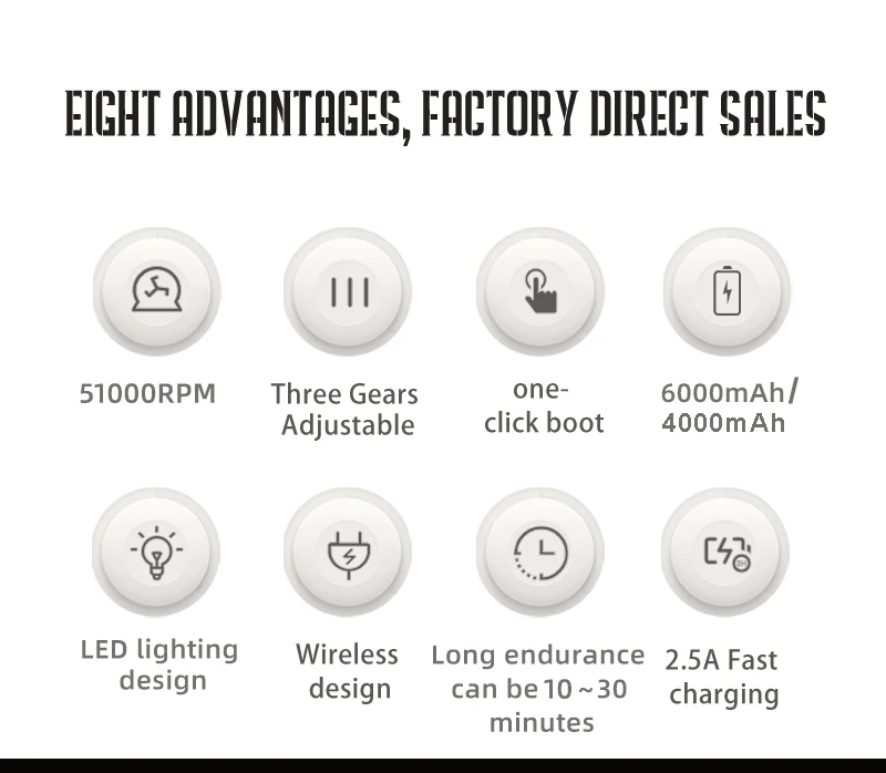 51000RPM/tres engranajes ajustables/diseño de iluminación de un solo clic boot / 6000mAh/4000mAh / LED/diseño inalámbrico/larga resistencia puede ser de 10 ~ 30