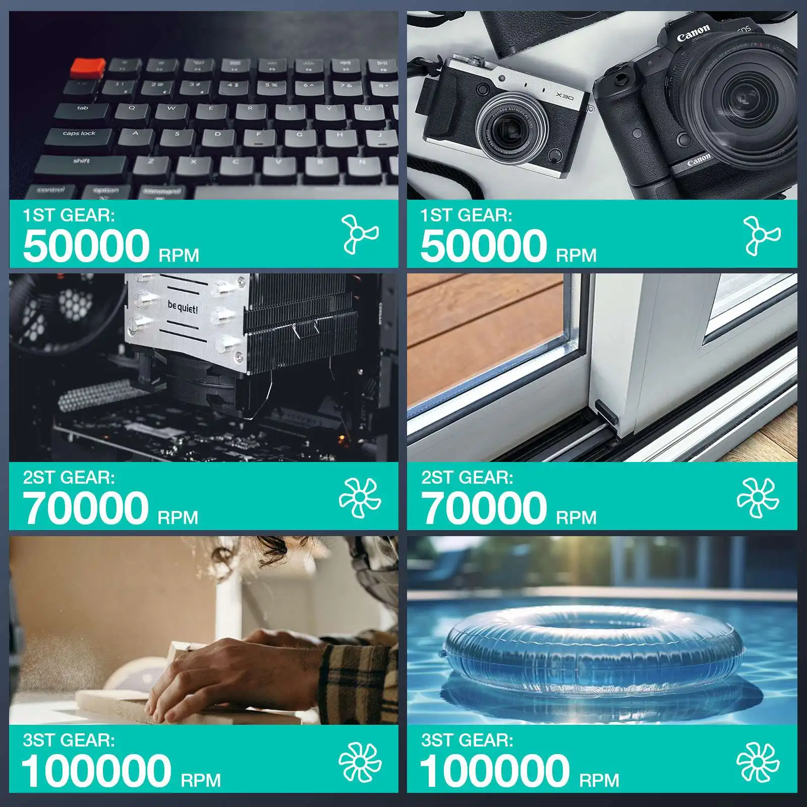 【Configuración de velocidad personalizable】Nuestra herramienta de aire comprimido ofrece tres velocidades ajustables: baja (50.000 RPM), media (70.000 RPM) y alta (100.000 RPM). Simplemente seleccione la velocidad más adecuada para sus necesidades de limpieza. El flujo de aire constante garantiza que sus objetos de valor permanezcan intactos.
