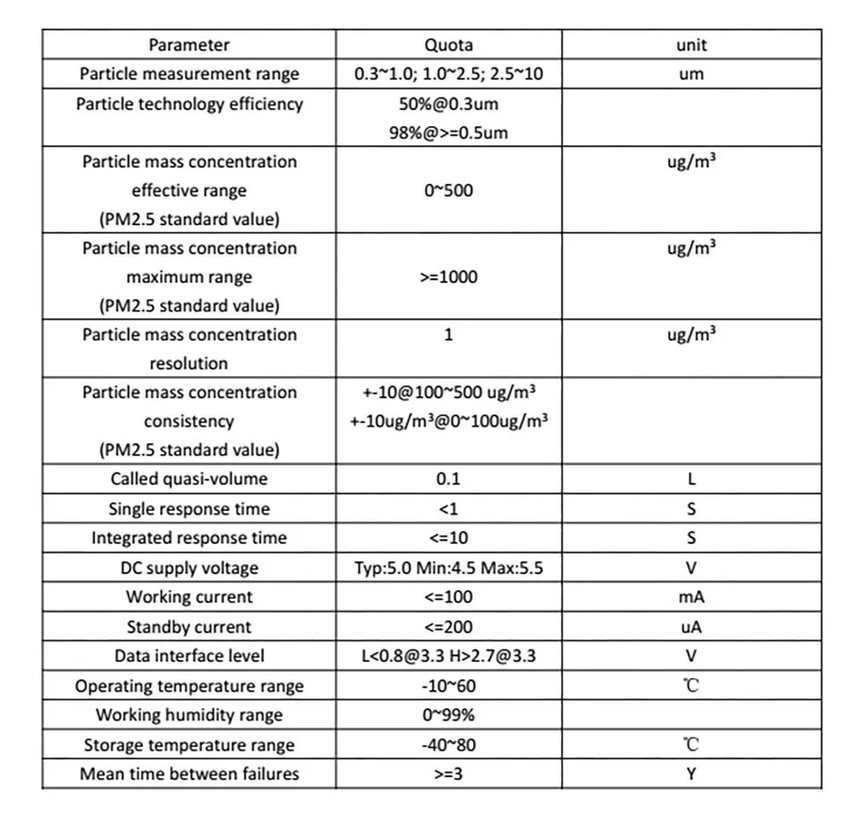The sensor uses the principle of laser scattering. It means that the laser light on the particles in the air and making the scattering, while collecting scattered light at a particular angle , resulting in scattered light intensity with time curve. Furthermore, the microprocessor uses the algorithm based on Mie (MIE) to obtain the equivalent particle size of the particles and the number of particles with different particle diameters per unit volume.