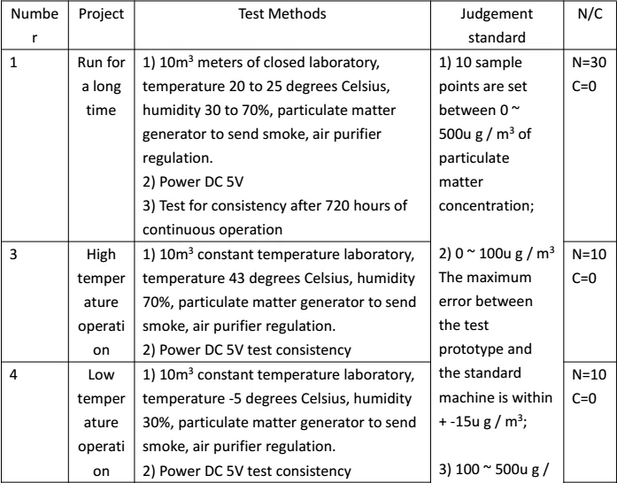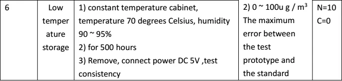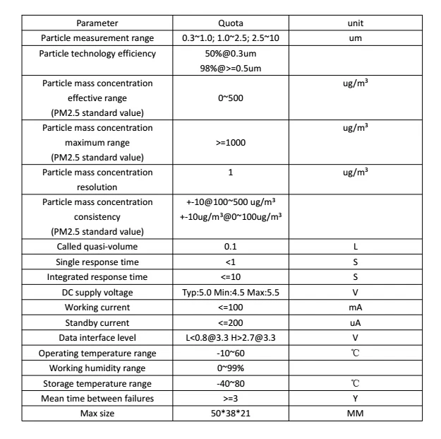 Nota:1) El rango máximo se refiere al sensor para garantizar que el valor estándar PM2.5 del valor de salida máximo no sea inferior a 1000 microgramos/metro cúbico.1000 microgramos/l metros cúbicos encima del sujeto medido.2) Datos de consistencia de concentración de partículas para el protocolo de comunicación en los datos 2 (consulte el Apêndice A) para medir las condiciones ambientales de 20 grados Celsius, humedad del 50%.