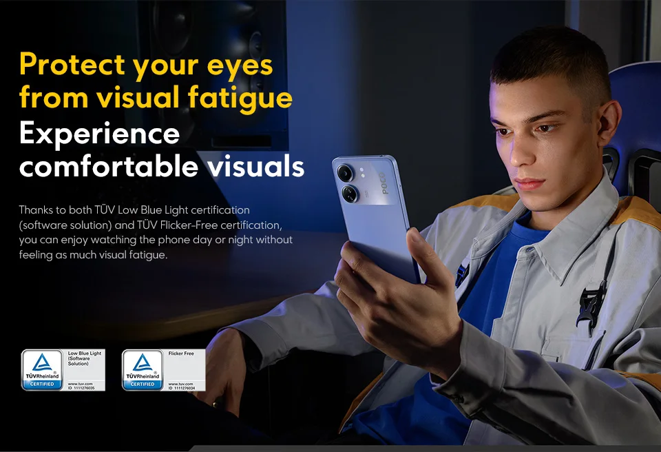 Gracias a la certificación TÜV Low Blue Light (solución de software) y la certificación TÜV Flicker-Free, puede disfrutar viendo el teléfono de día o de noche sin sentir tanta fatiga visual.