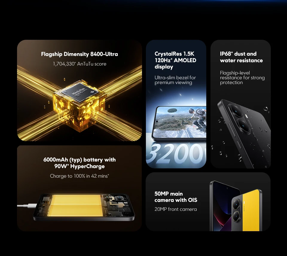 Insignia Dimensity 8400-Ultra | Batería de 6000mAh (tipo) | Hipercarga de 90W | Pantalla CrystalRes 1,5 K 120Hz AMOLED | Cámara principal de 50MP con OlS | Resistencia al polvo y al agua IP68