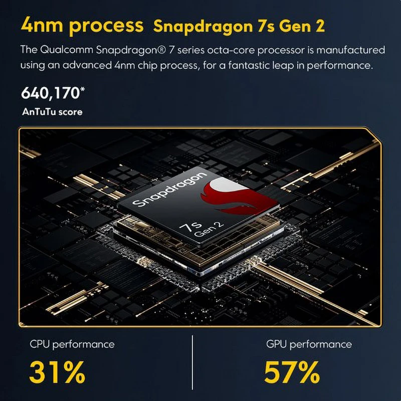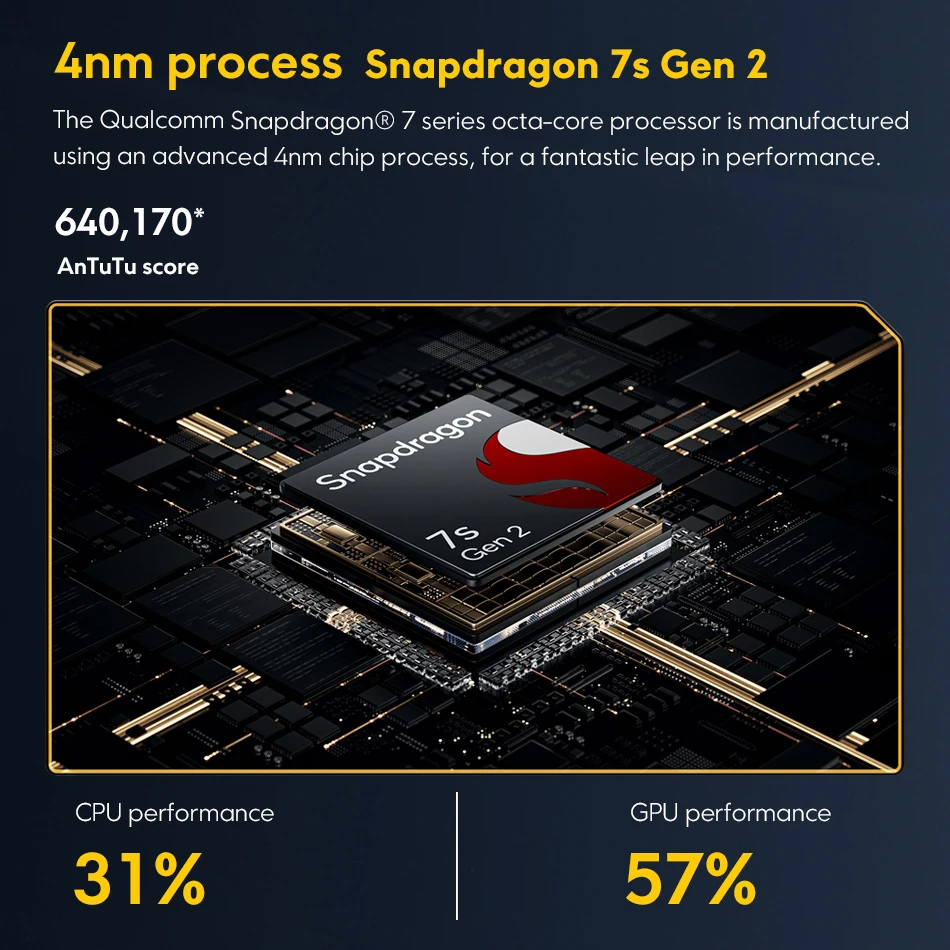Potente Snapdragon 7s Gen 2, CrystalRes 120Hz Flujo AMOLED
