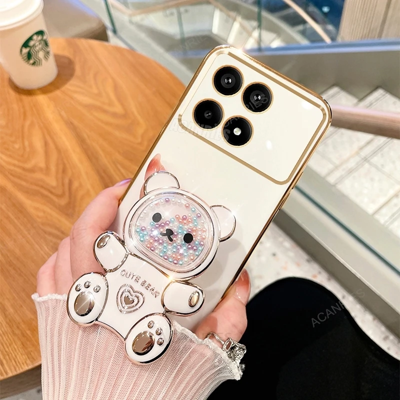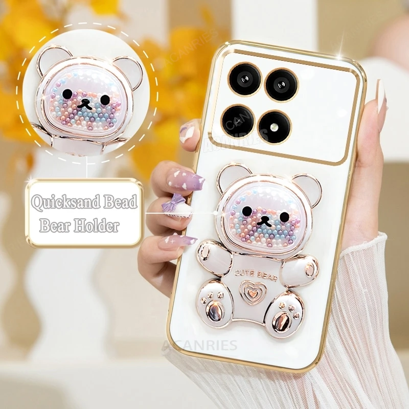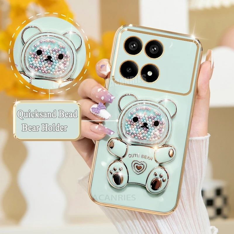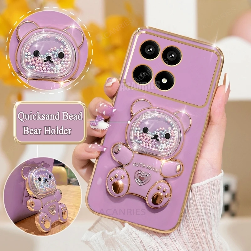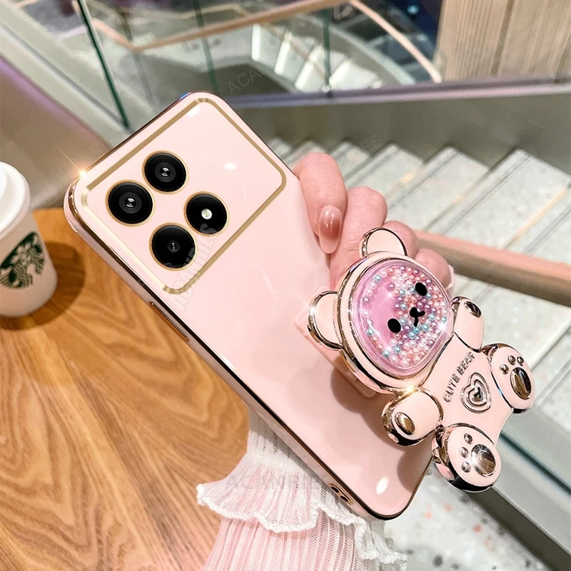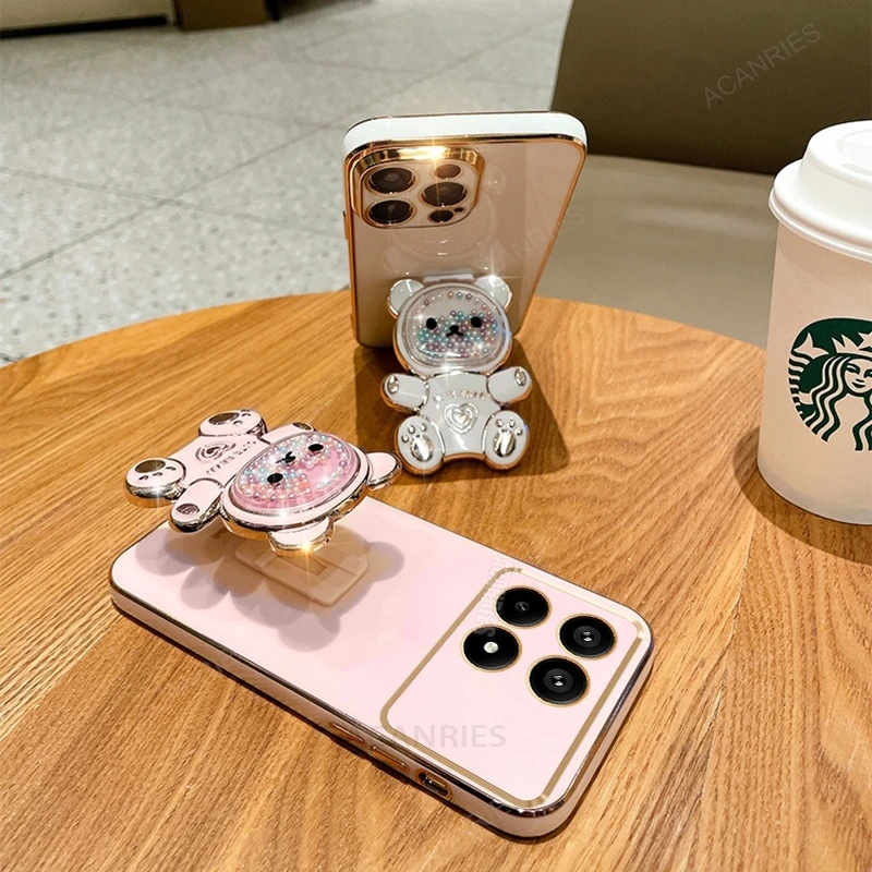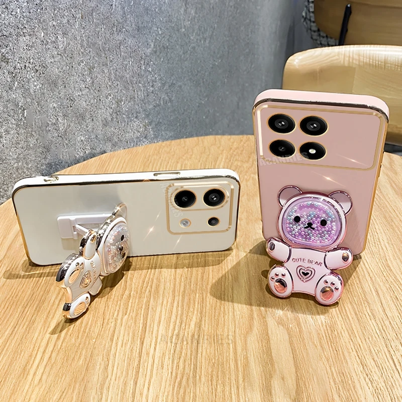 Pocox6 Quicksand Bear Holder Plating Case On For Xiaomi Mi Poco X6 Pro 5g F6 M6 X5 X3 C75 C65 C55 Silicone Stand Cover Pocox6pro