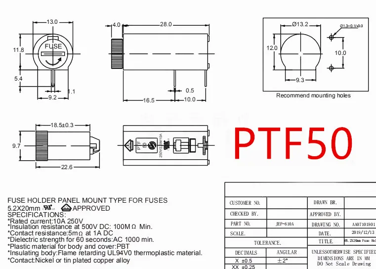 Portafusibles de 5x20MM, 20 piezas/50, 10A250V, 2,5 W, montaje en Panel PCB, Vertical/Horizontal, resistencia a altas temperaturas, PTF45/50