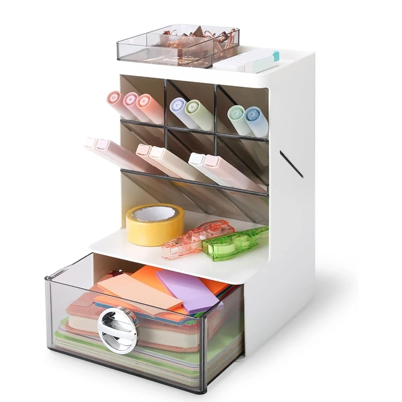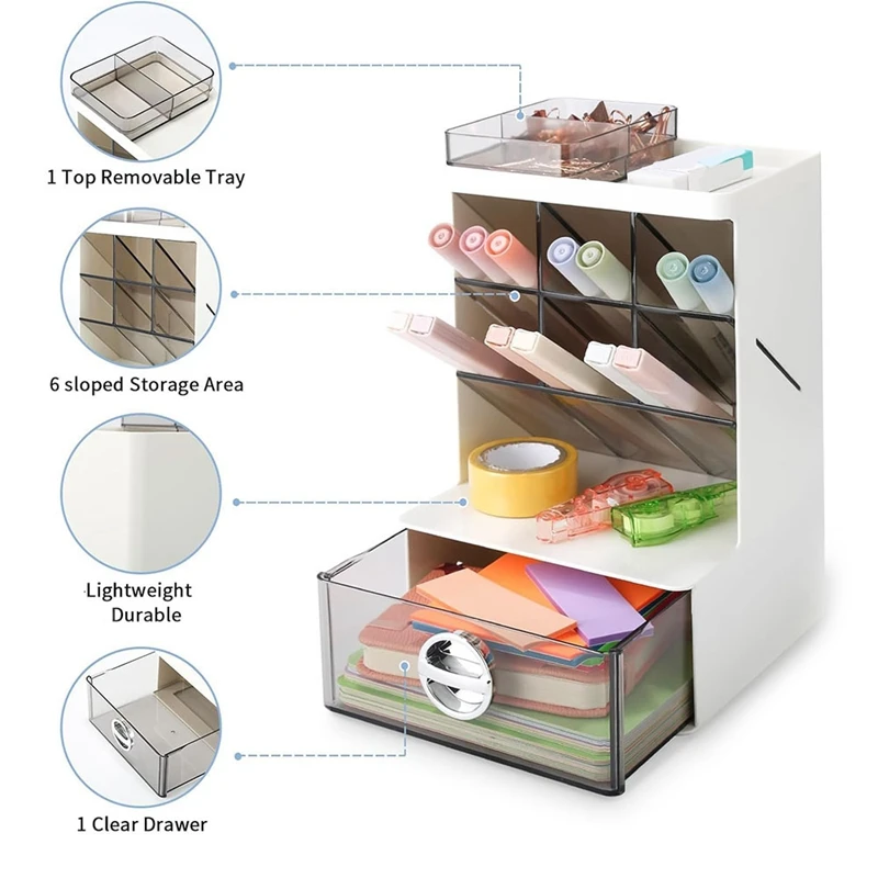 [Lindo portalápices para escritorio] Este organizador de escritorio con cajones cuenta con 6 compartimentos inclinados y 1 cajón transparente con una bandeja extraíble en la parte superior.Tiene una capacidad espaciosa, lo que le ayuda a organizar cuidadosamente varios útiles escolares como bolígrafos, clips, reglas, borradores, notas adhesivas y más, manteniendo su escritorio de estudio ordenado y limpio.