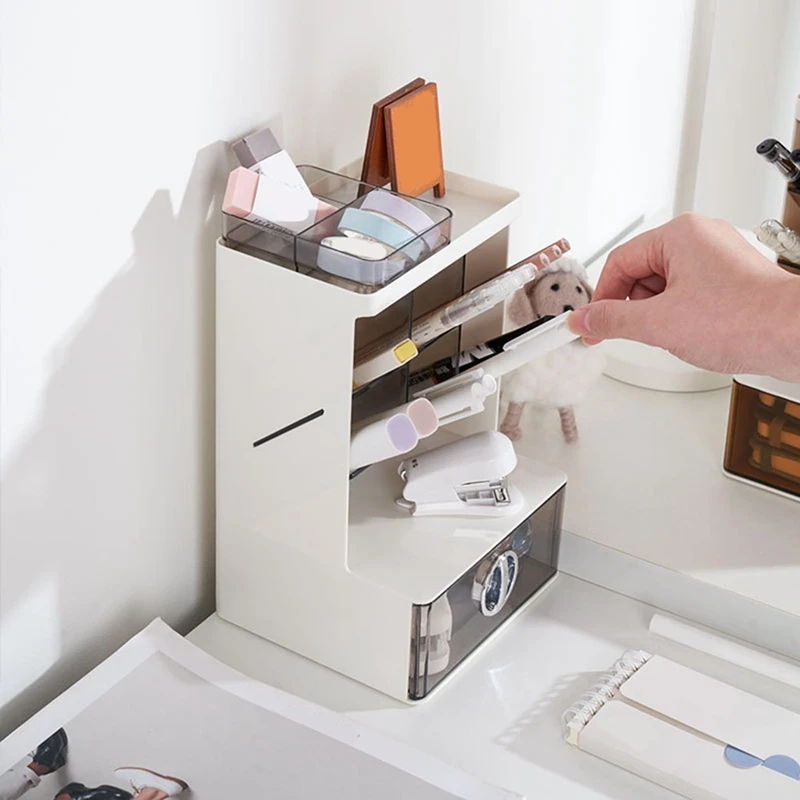 [Organizador de bolígrafos de escritorio blanco con cajón] Este portalápices de escritorio viene con un cajón transparente que sirve como un compartimento de almacenamiento adicional para pequeños suministros de oficina como clips, notas adhesivas o borradores, lo que ayuda a mantener ordenado su espacio de trabajo.