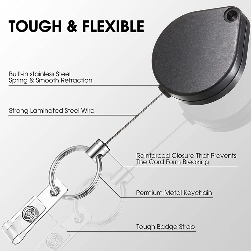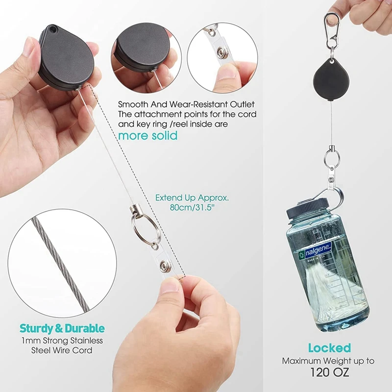 El fuerte cable de acero retráctil se extiende hasta 31,5 pulgadas, lo que es ideal para la mayor parte de la longitud del brazo, sin necesidad de preocuparse por la dificultad de estiramiento, fácil de entrar y salir en varios lugares