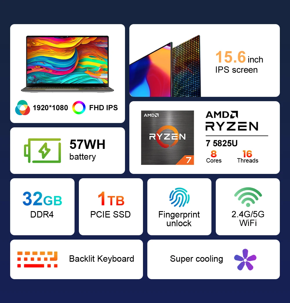 Comprar Portátil para juegos Ninkear A15 Plus AMD Ryzen ™ 7 5825U 4.5Ghz 15.6' FHD IPS 32GB DDR4 1TB SSD Teclado retroiluminado Desbloqueo de huellas dactilares