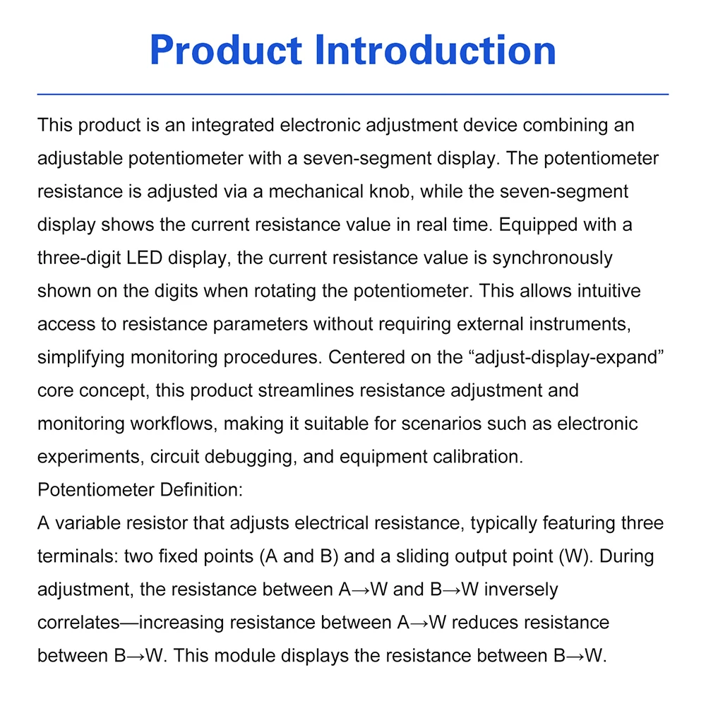 Durante el posicionamiento, el valor de resistencia actual se muestra sincrónicamente en el tubo digital de tres dígitos y el parámetro de resistencia se puede obtener intuitivamente sin necesidad de un instrumento externo, simplificando el proceso de monitoreo.Este producto está centrado en "expansión de pantalla de ajuste", lo que simplifica el proceso de ajuste y monitoreo de resistencia, y es adecuado para experimentos electrónicos, depuración de circuitos, calibración de equipos y otros escenarios.