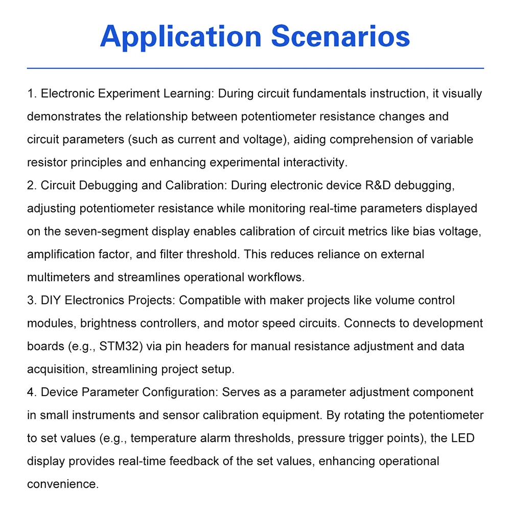 1.Aprendizaje de experimentos electrónicos: en el estudio de los conceptos básicos del circuito, es posible demostrar visualmente la correlación entre los cambios de resistencia de los potenciómetros y los parámetros del circuito (como corriente y voltaje), ayudando a comprender el principio de funcionamiento de las resistencias variables y mejorar la interactividad de experimentos.