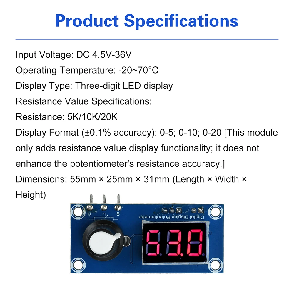 Formato de visualización (error ± 0,1): 0-5; 0-10; 0-20 [Este módulo solo agrega la función de mostrar los valores de resistencia, sin mejorar la precisión de los valores de resistencia del potenciómetro.]