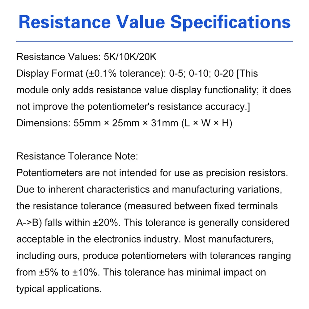 Formato de visualización (error ± 0,1): 0-5; 0-10; 0-20 [Este módulo solo agrega la función de mostrar los valores de resistencia, sin mejorar la precisión de los valores de resistencia del potenciómetro.]