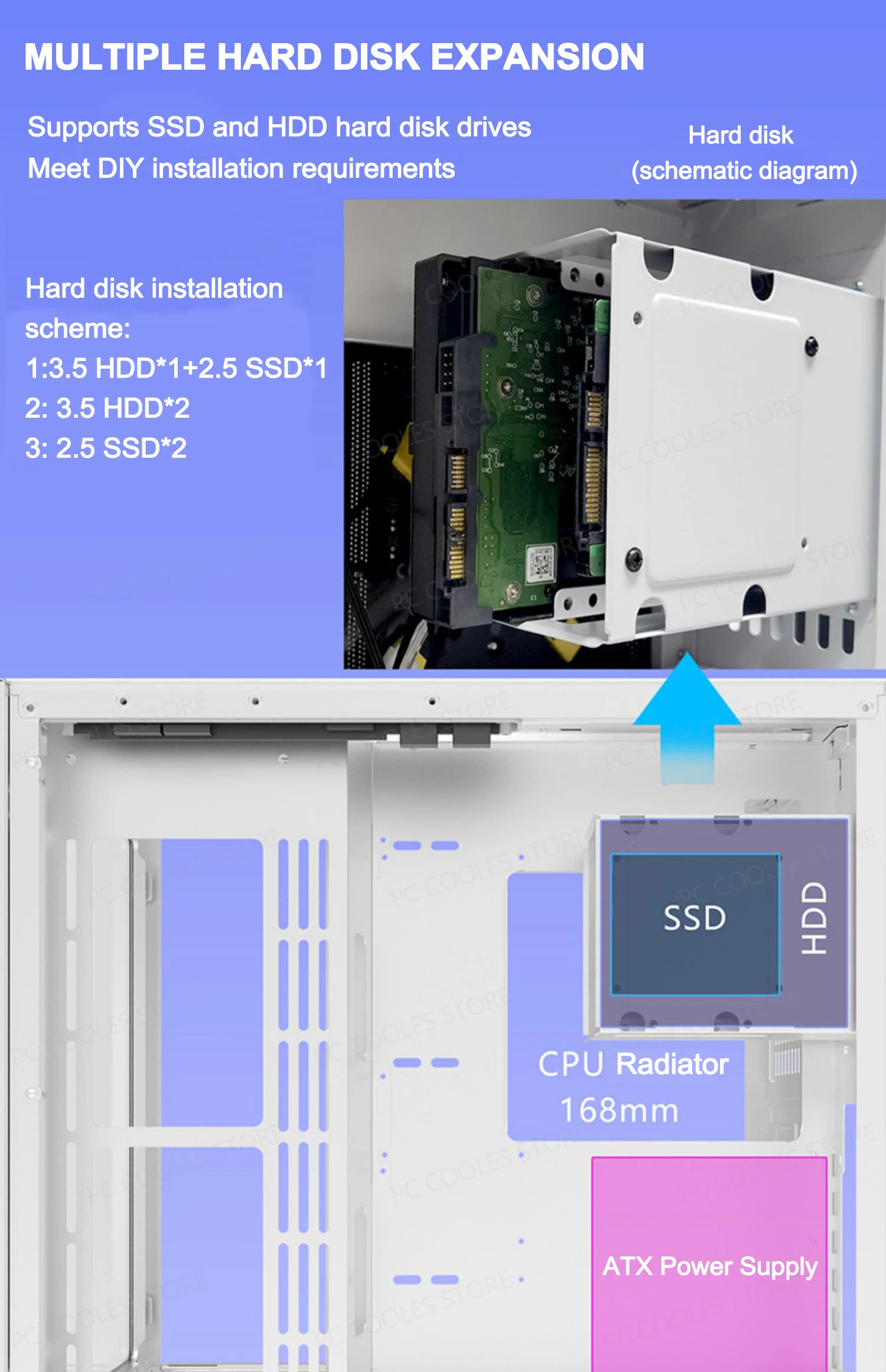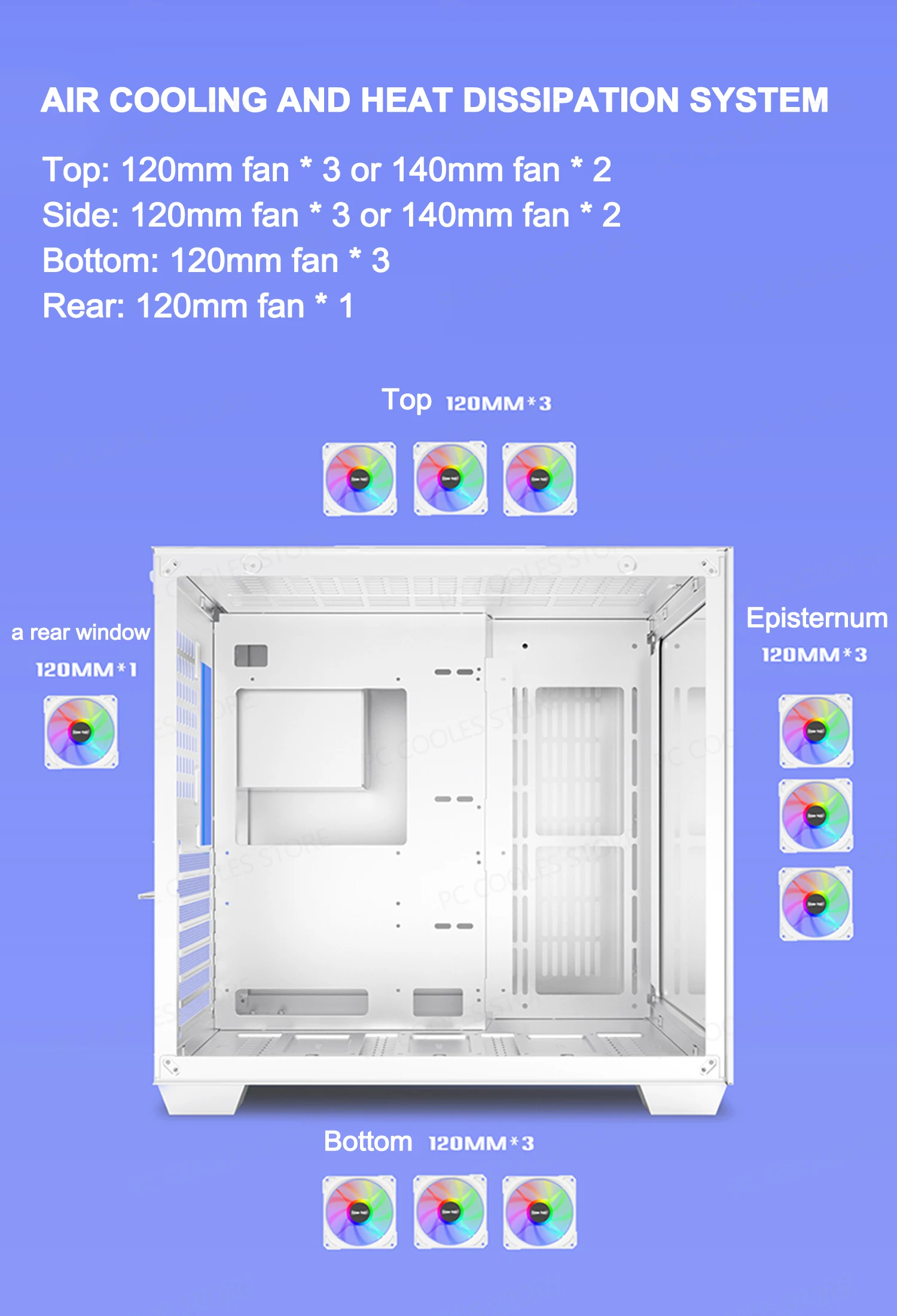 Superior: ventilador de 120mm * ventilador de 3 o 140mm * 2 Lado: ventilador de 120mm * ventilador de 3 o 140mm * 2