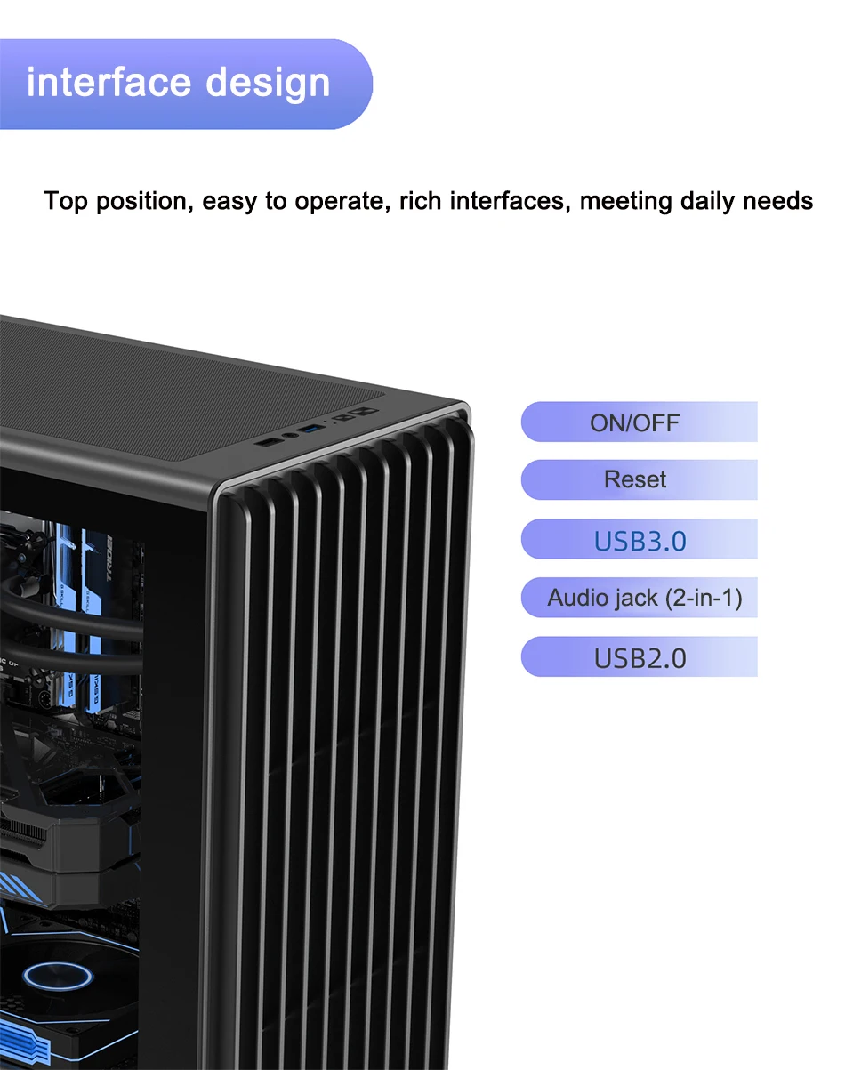Interfaz del panel: USB 3.0 * 1/USB 2.0 * 1/compatible con disco duro HDAUDIO: 3,5 "HDD * 2, 2,5" SSD * 1