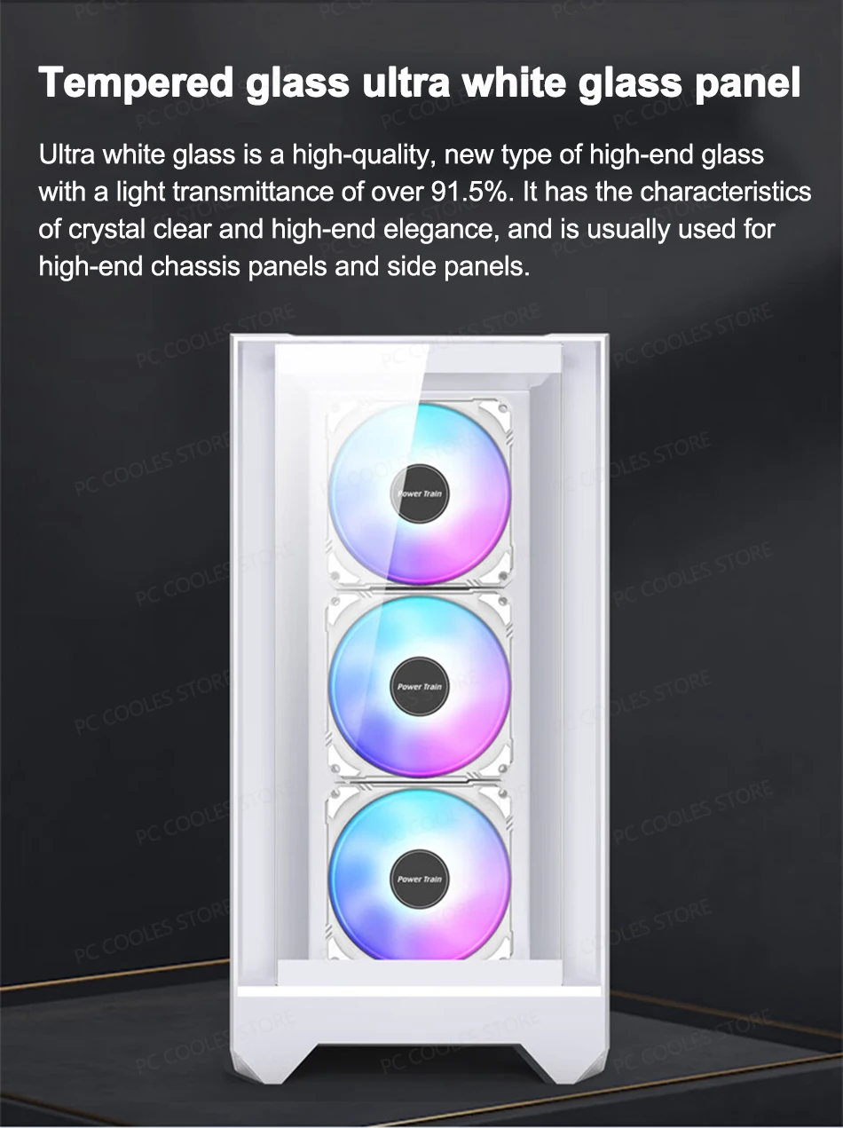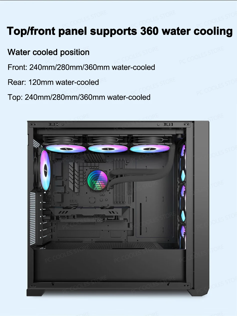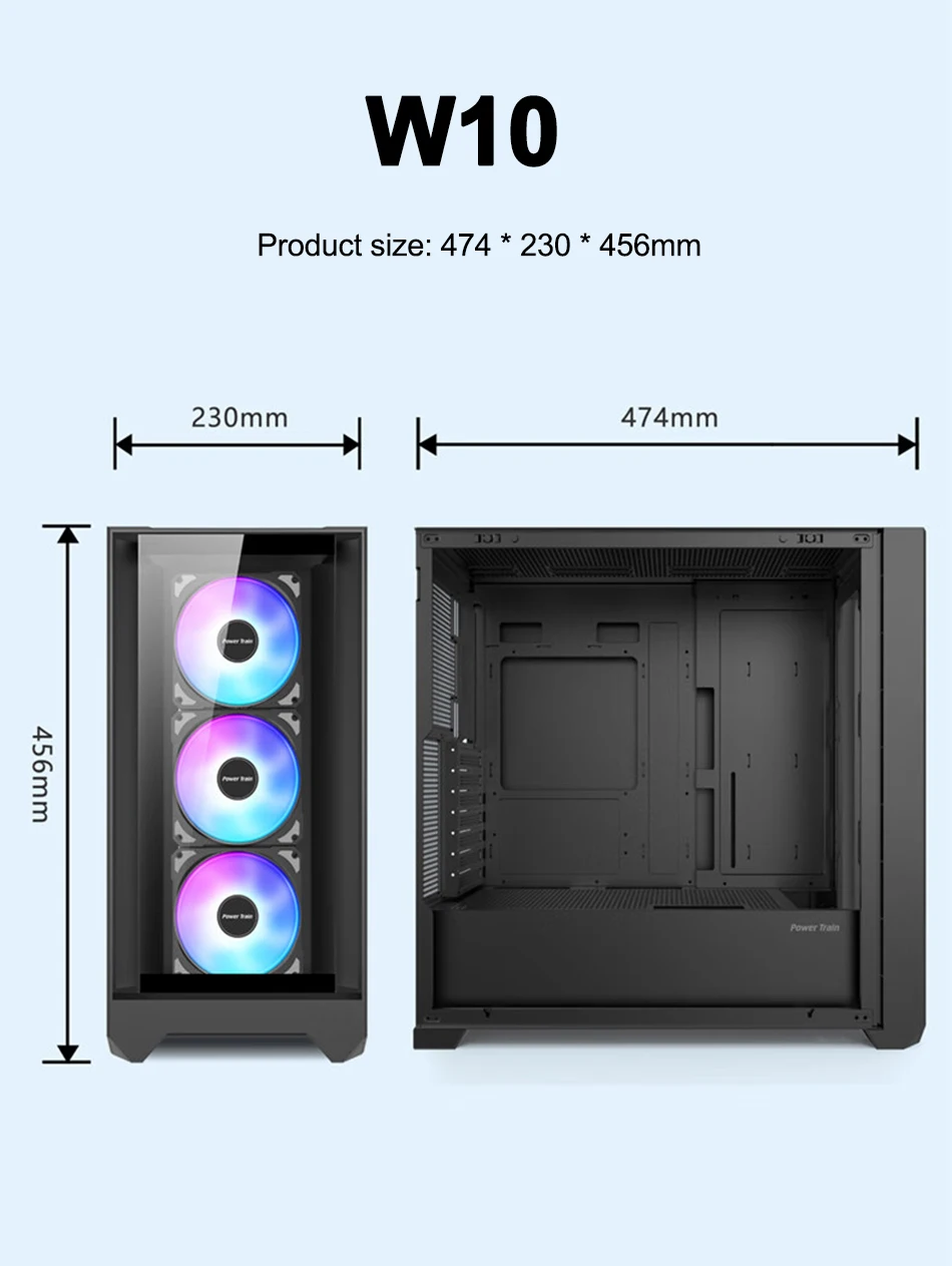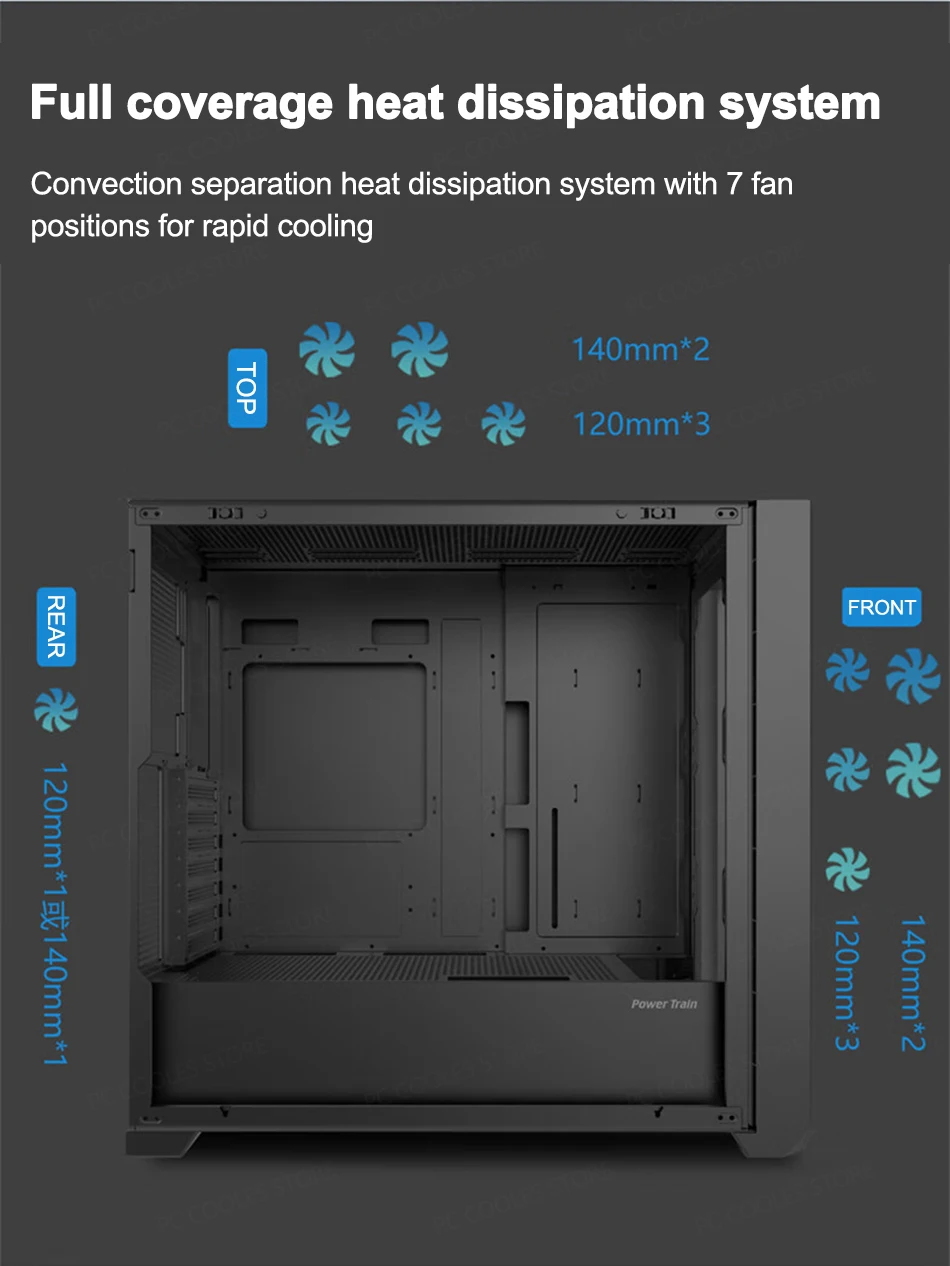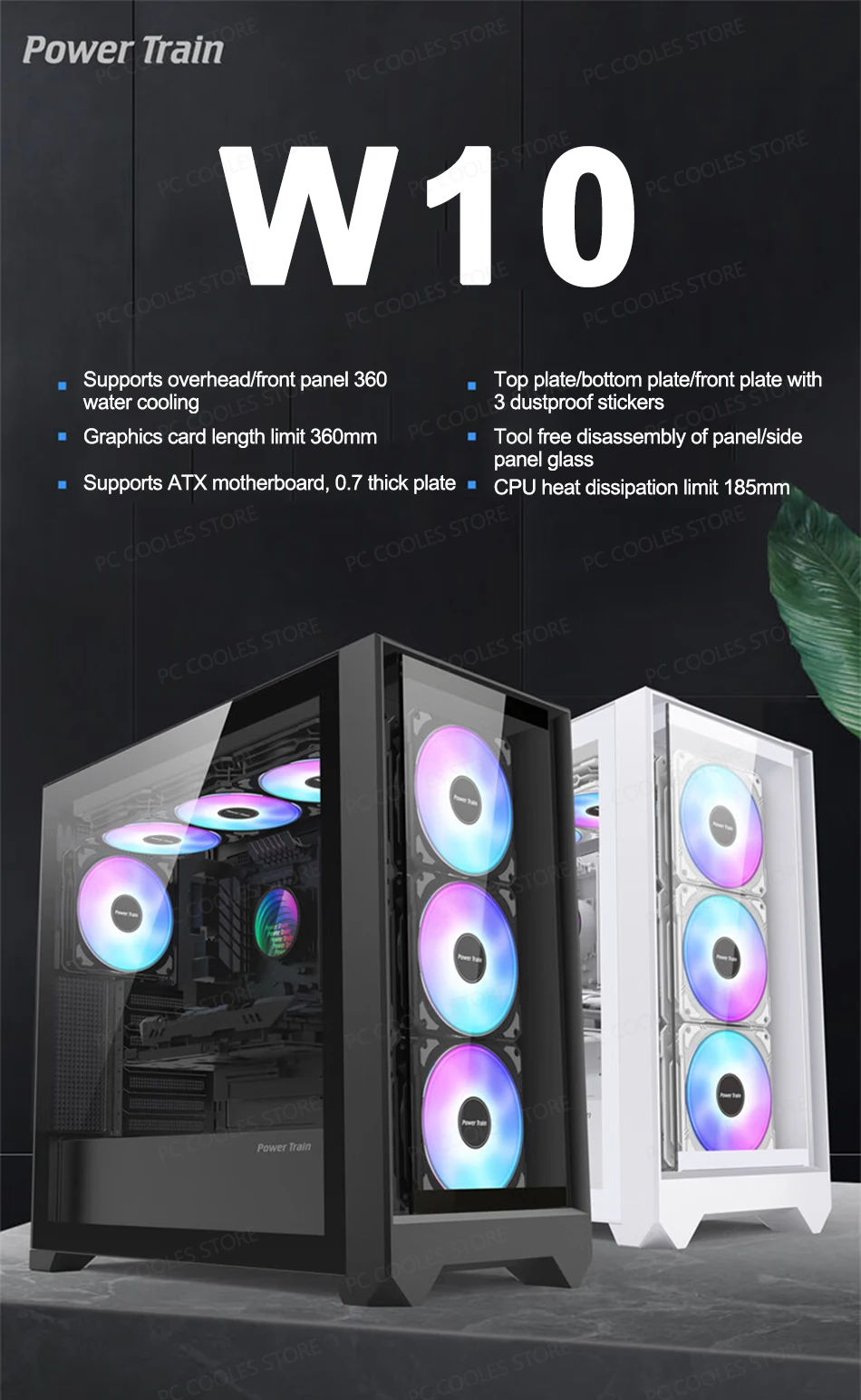 Comprar Power Train W10 ATX carcasa de vidrio templado transparente lateral, 7 ventiladores para enfriador de agua 360, 260mm, chasis de escritorio para tarjeta gráfica