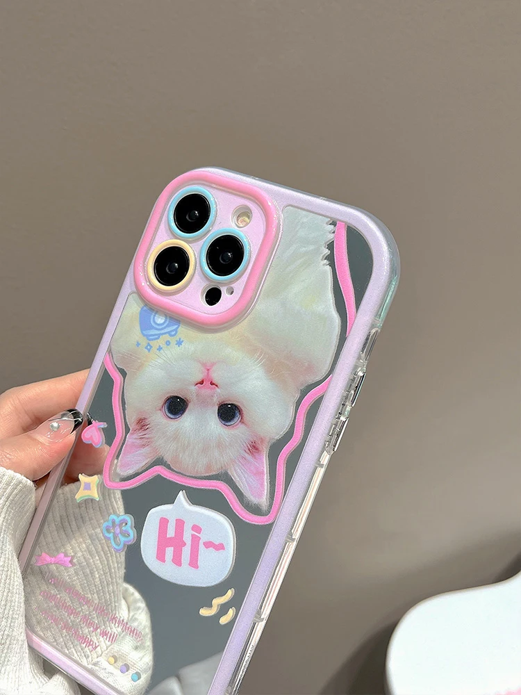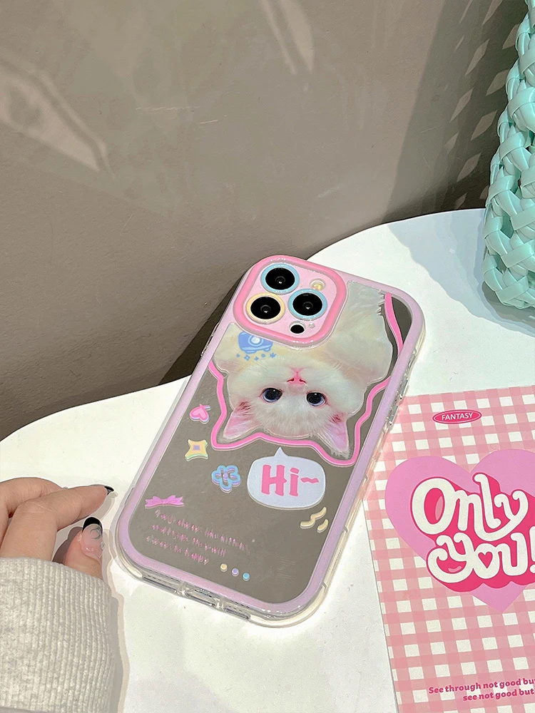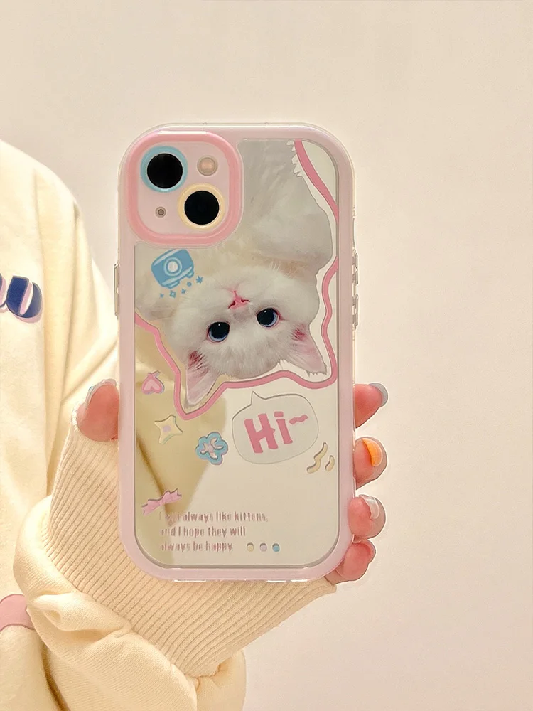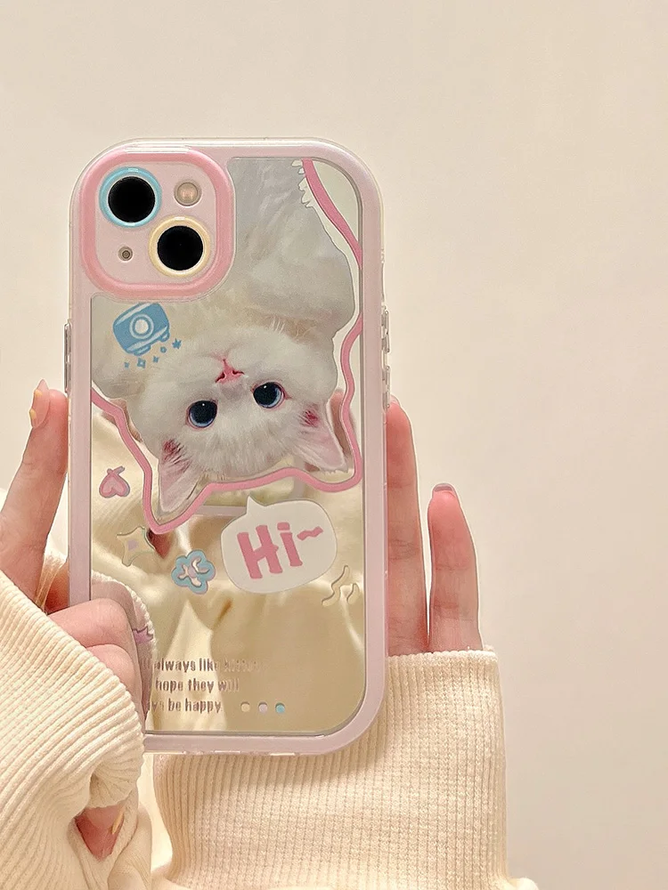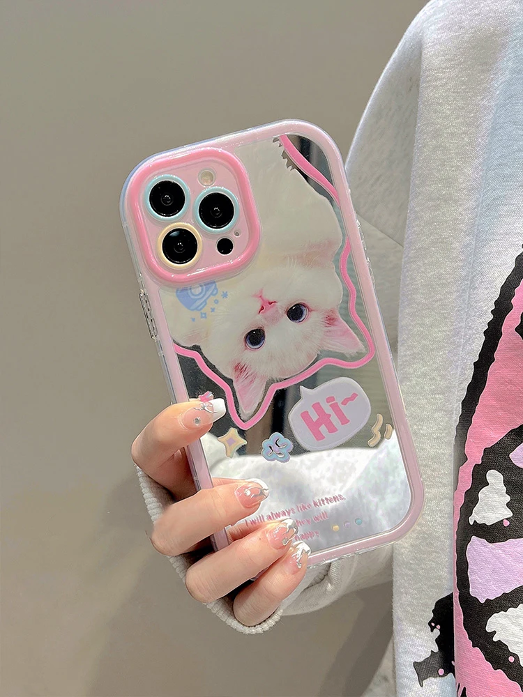 Preciosa funda de espejo de maquillaje de gato blanco para iPhone 14 Pro Max 15 13 11 12, funda trasera bonita con parachoques de silicona