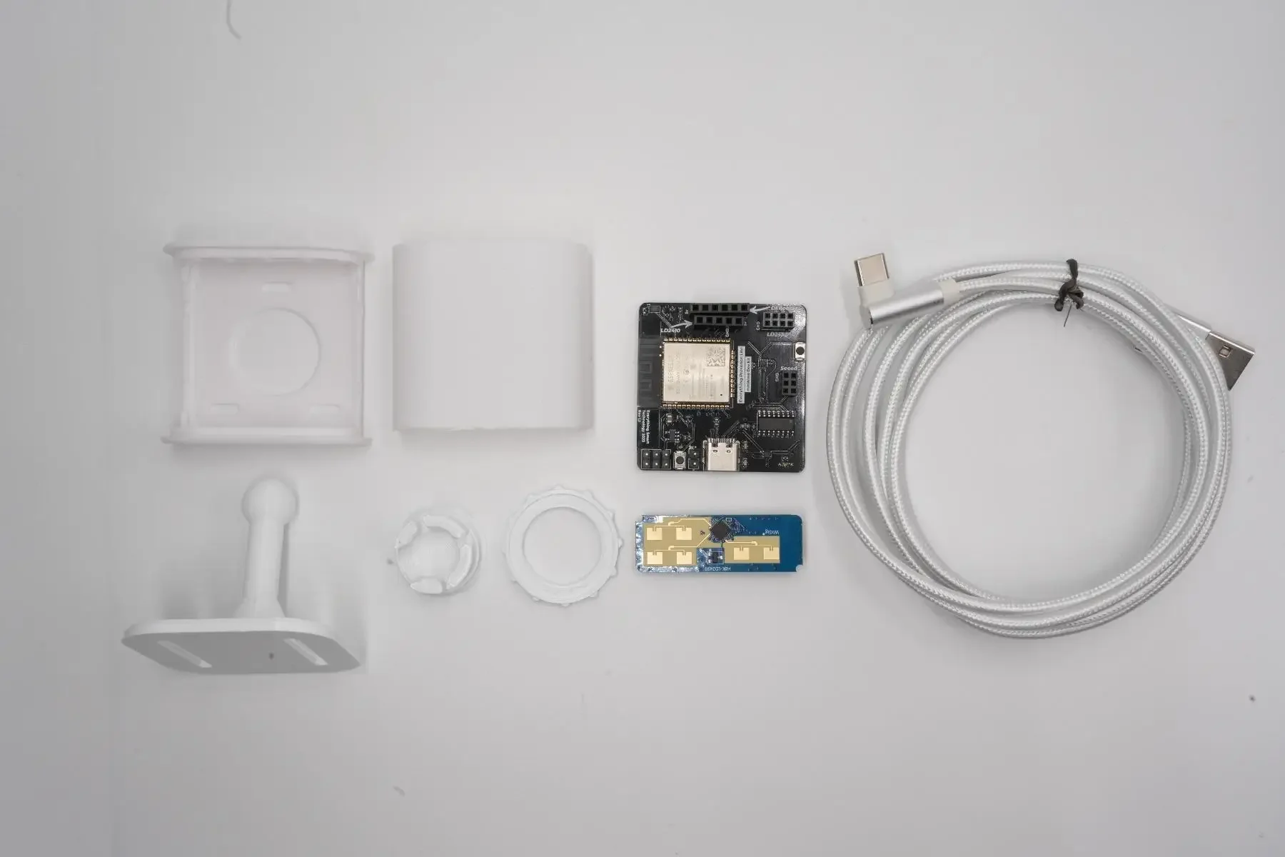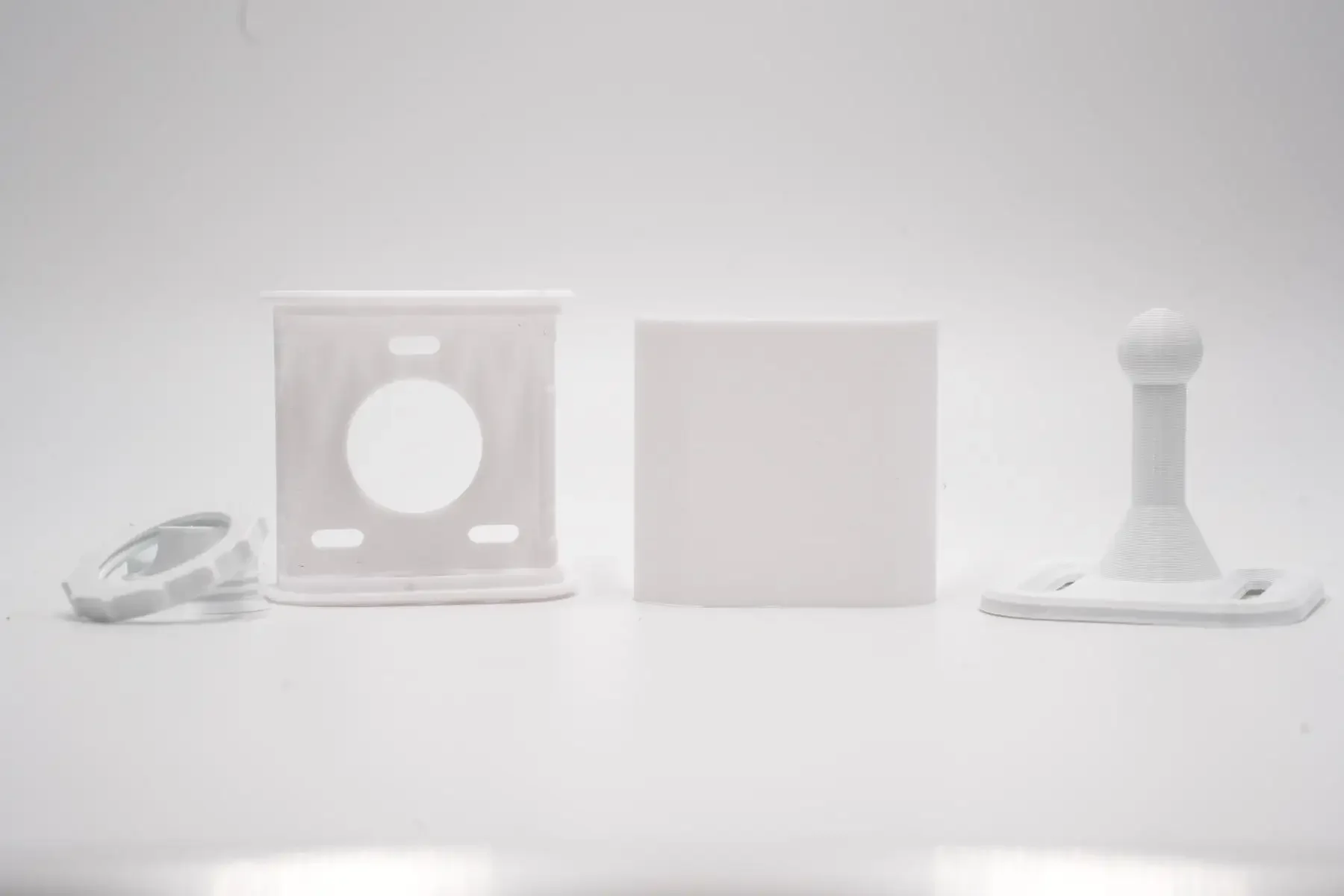 El dispositivo viene en una carcasa blanca moldeada por inyección.Para aquellos que prefieren la personalización, los archivos STL para todos los componentes de la carcasa (delantero, trasero, soporte, rótula y anillo de bloqueo) sonpara remix e impresión 3D.