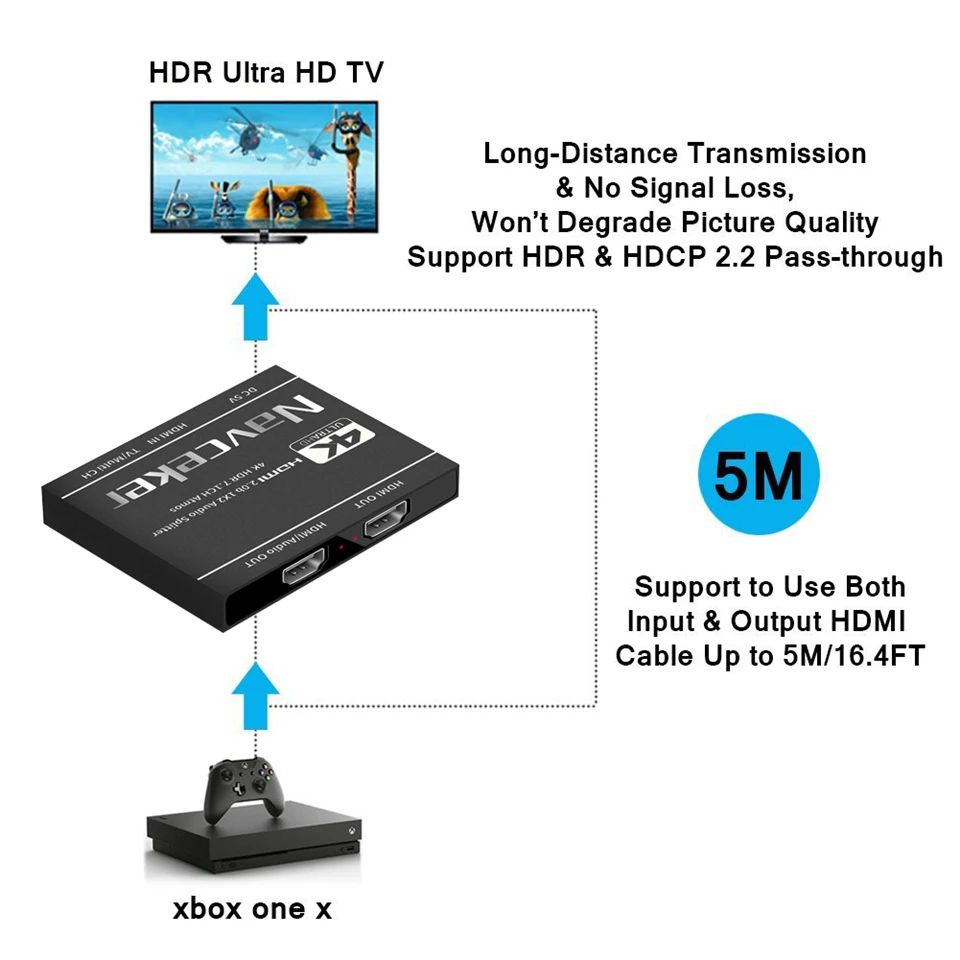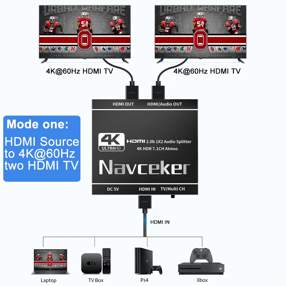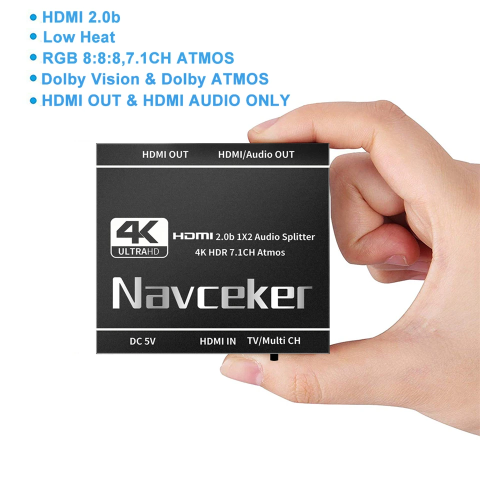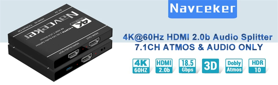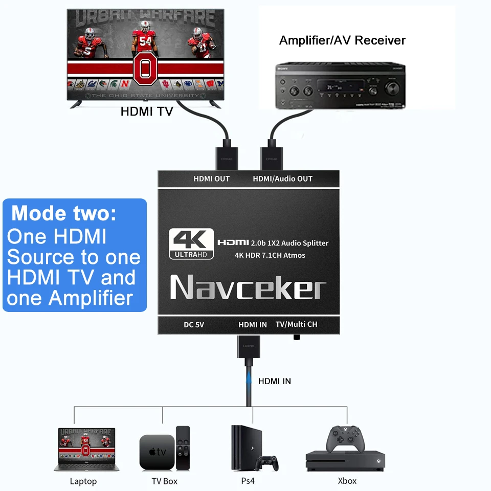 · HDMI2.Extractor divisor de audio 0b: Navceker HDMI 1 entrada 2 salidas Splitter 4K@60Hz puede distribuir 1 señal de entrada HDMI a una pantalla HDMI (TV, monitor, proyector, etc.) y un AUDIO HDMI SOLAMENTE (amplificador, receptor AV, etc.).duplicando o reflejar vídeo y audio simultáneamente con cualquier pérdida.