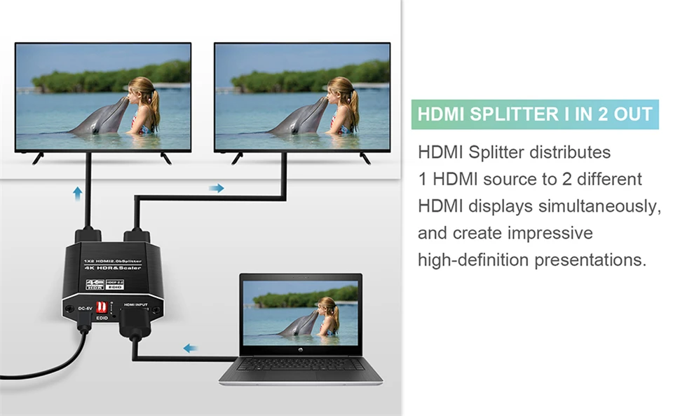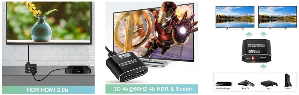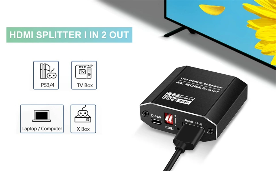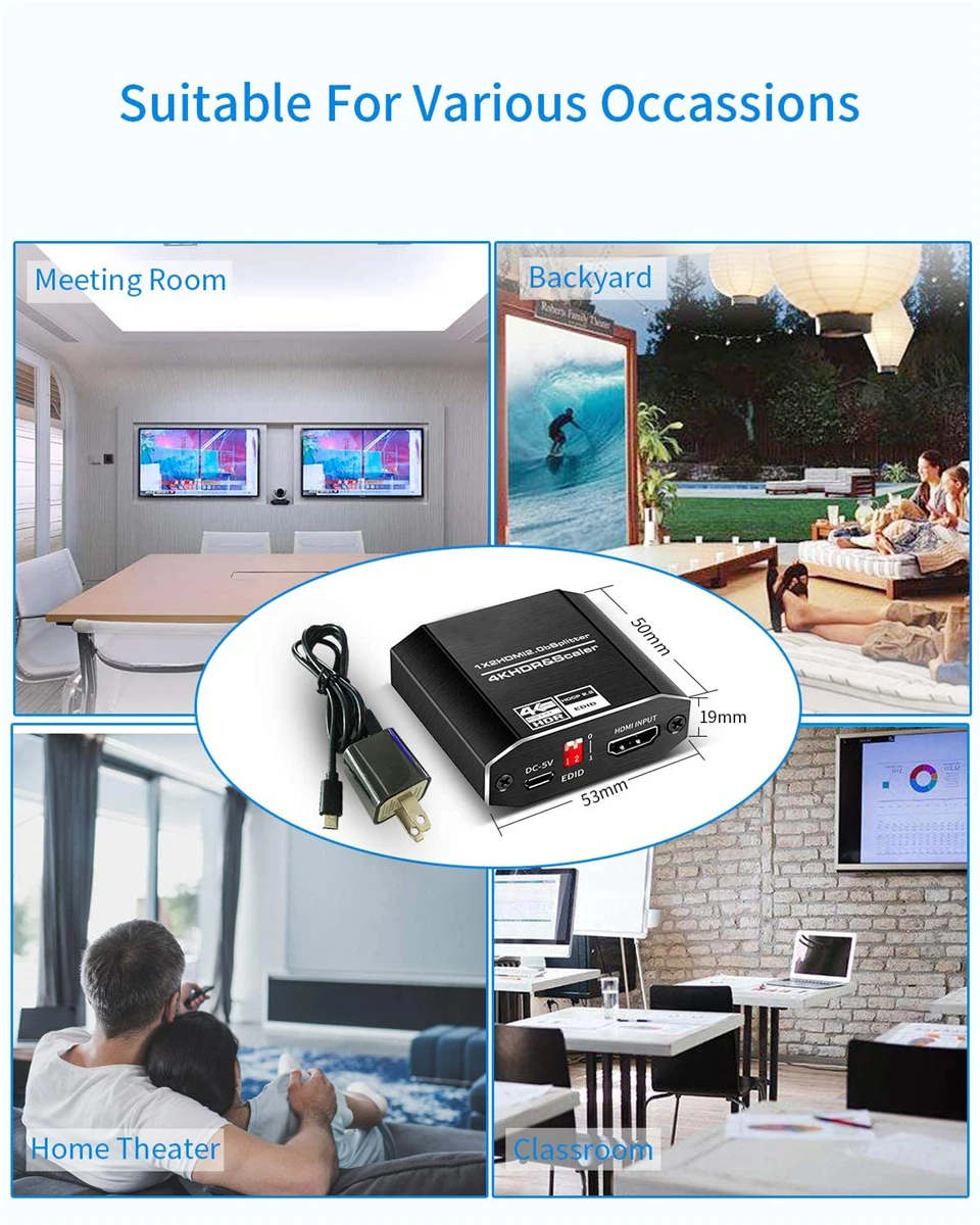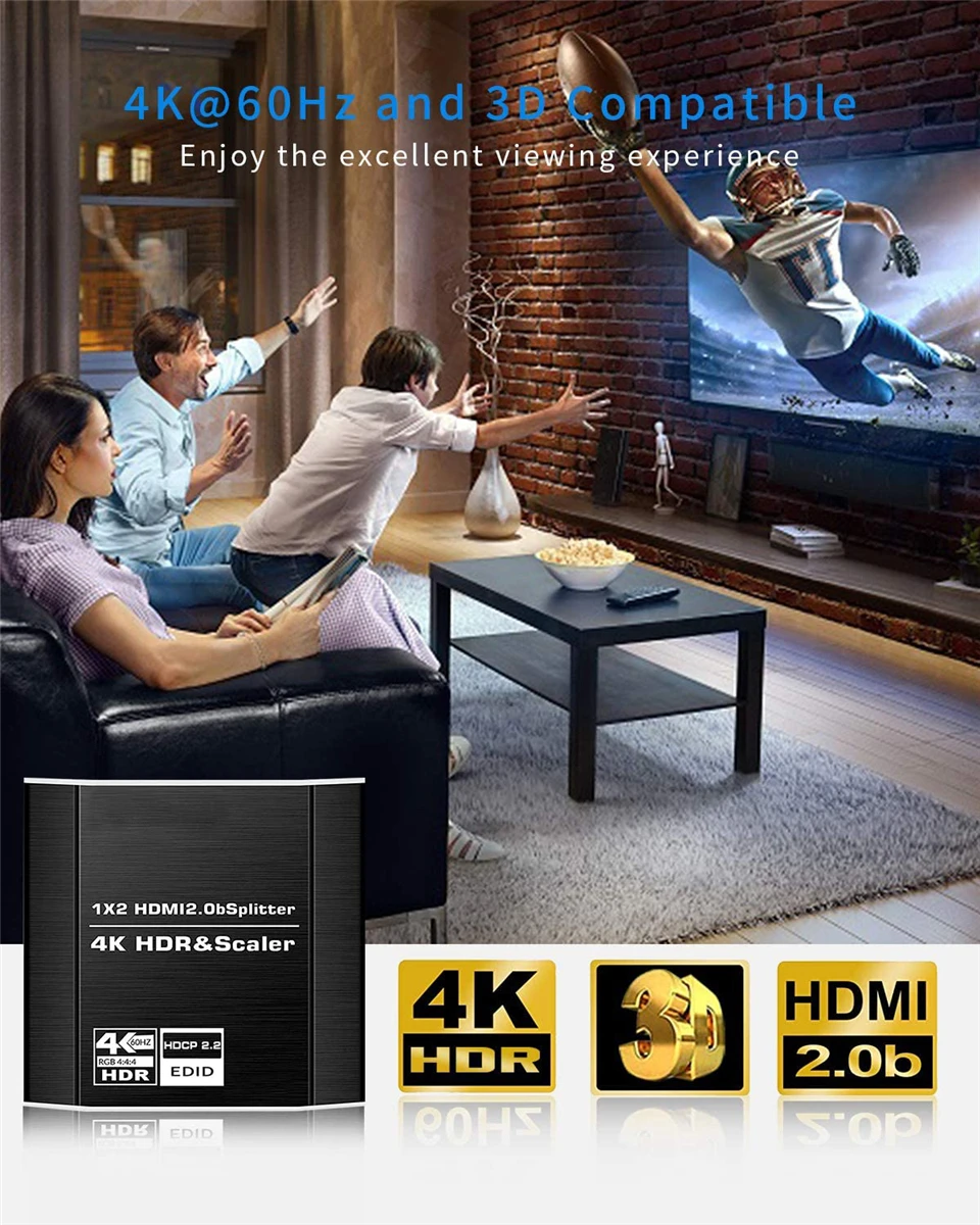 El divisor HDMI 4K admite diferentes resoluciones de visualización de hasta 4K, incluyendo 3D, Full HD 1080P, 4K @ 60Hz, 4K HDR y Scaler. Admite modo EDID.
