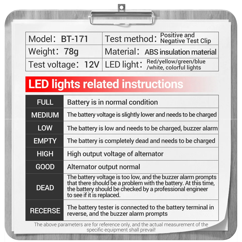 4. Tiene funciones de alarma de conexión inversa y protección contra sobretensión. El clip rojo está conectado al polo positivo "+" y el clip negro está conectado al polo negativo "-". Si la conexión se invierte, la pantalla LED no se mostrará y la luz indicadora de INVERSIÓN se iluminará y emitirá un aviso de alarma