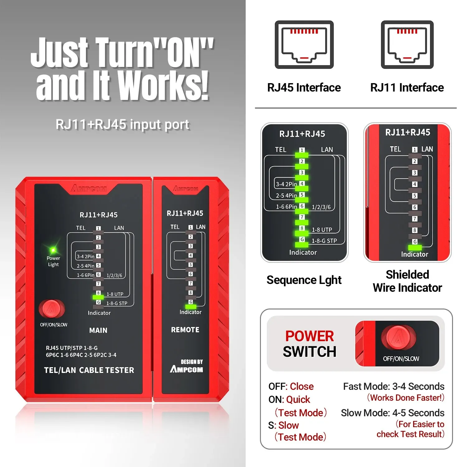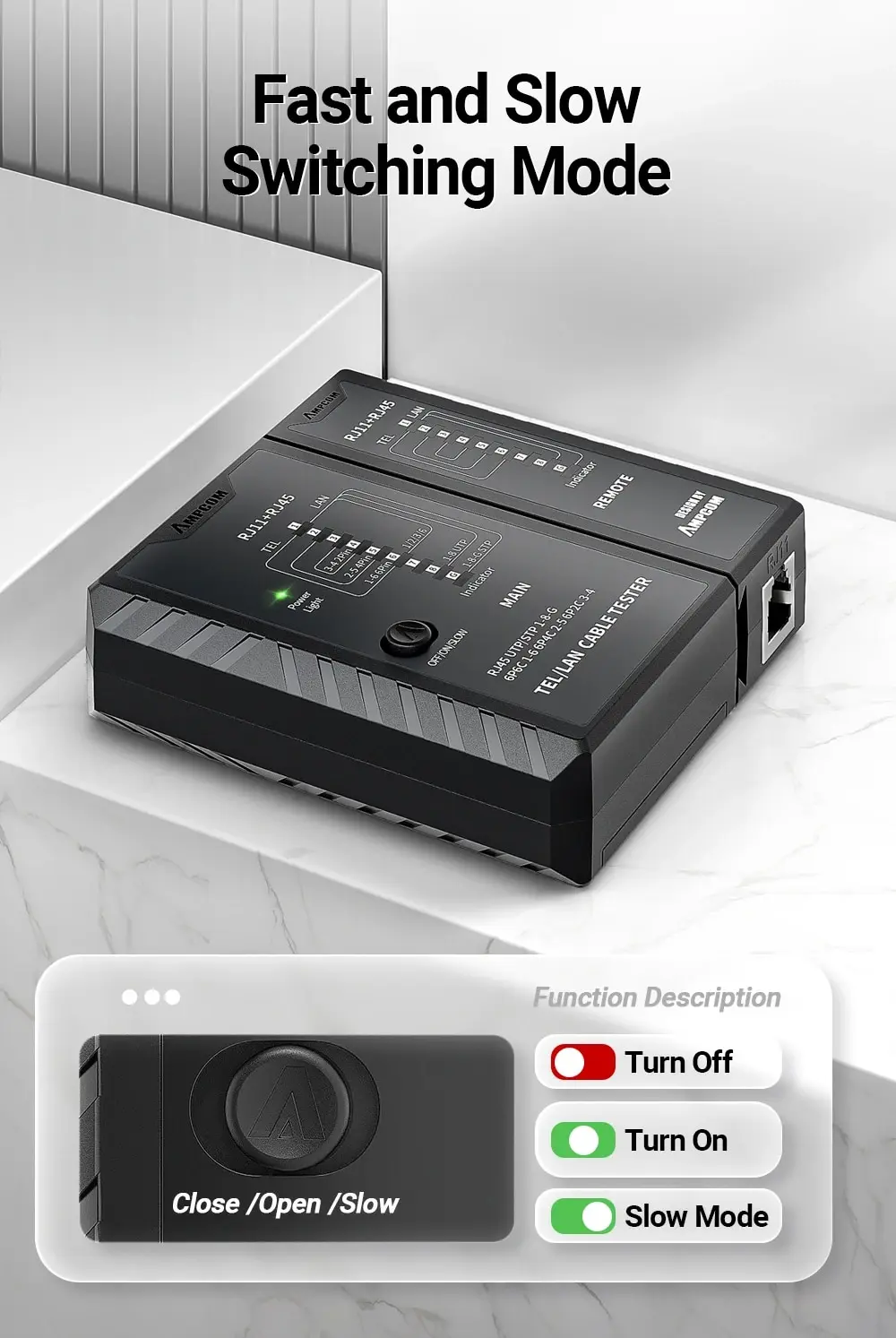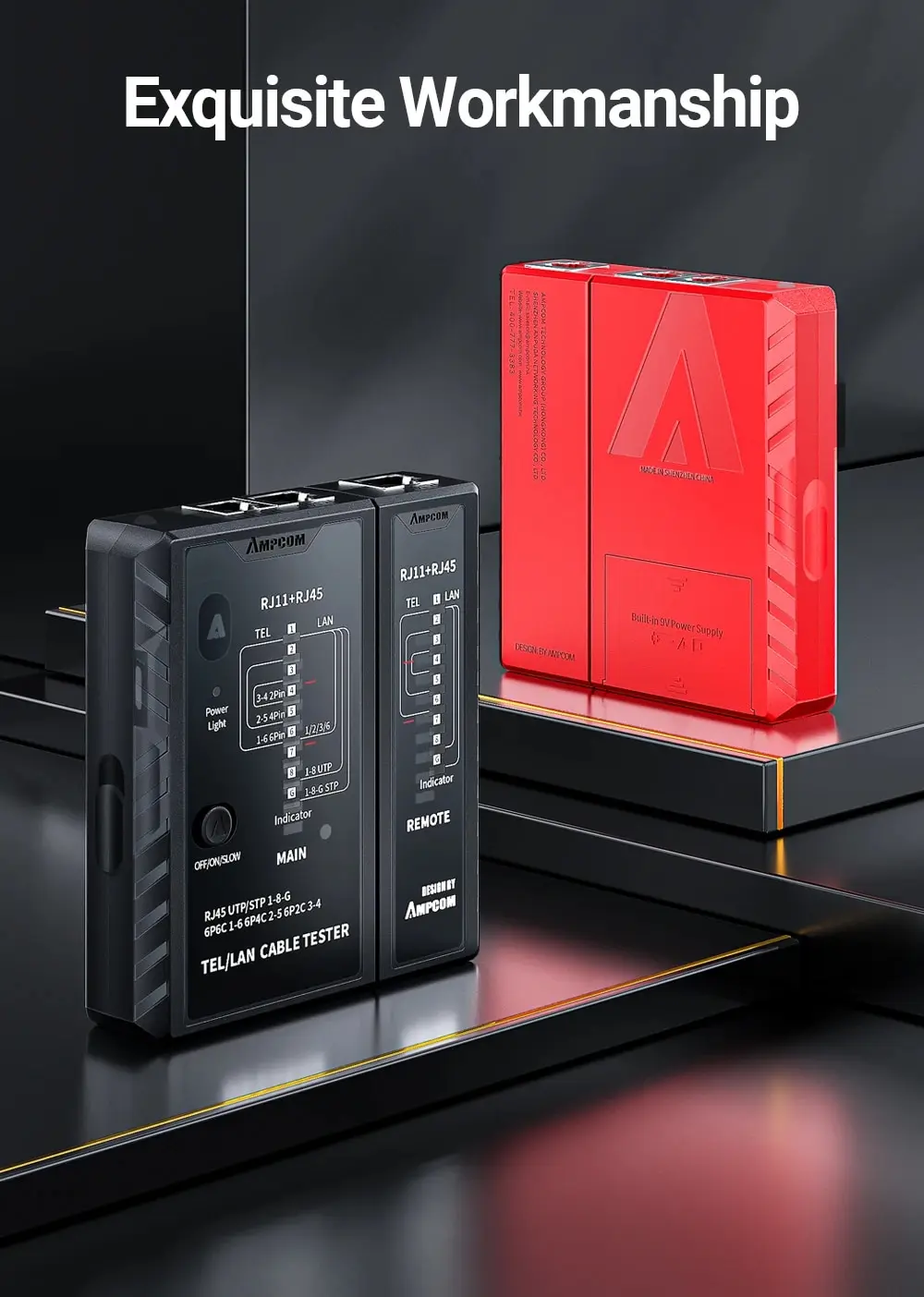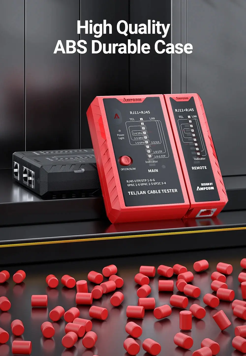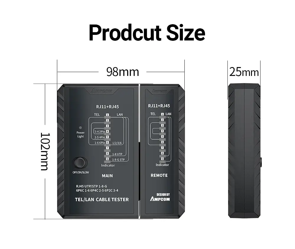 • Probador del cable de Lan del establecimiento de una red RJ45:El probador del cable de la red de AMPCOM se diseña para el Lan del establecimiento de una red RJ45, proporcionando capacidades de prueba completas y exactas para su red.