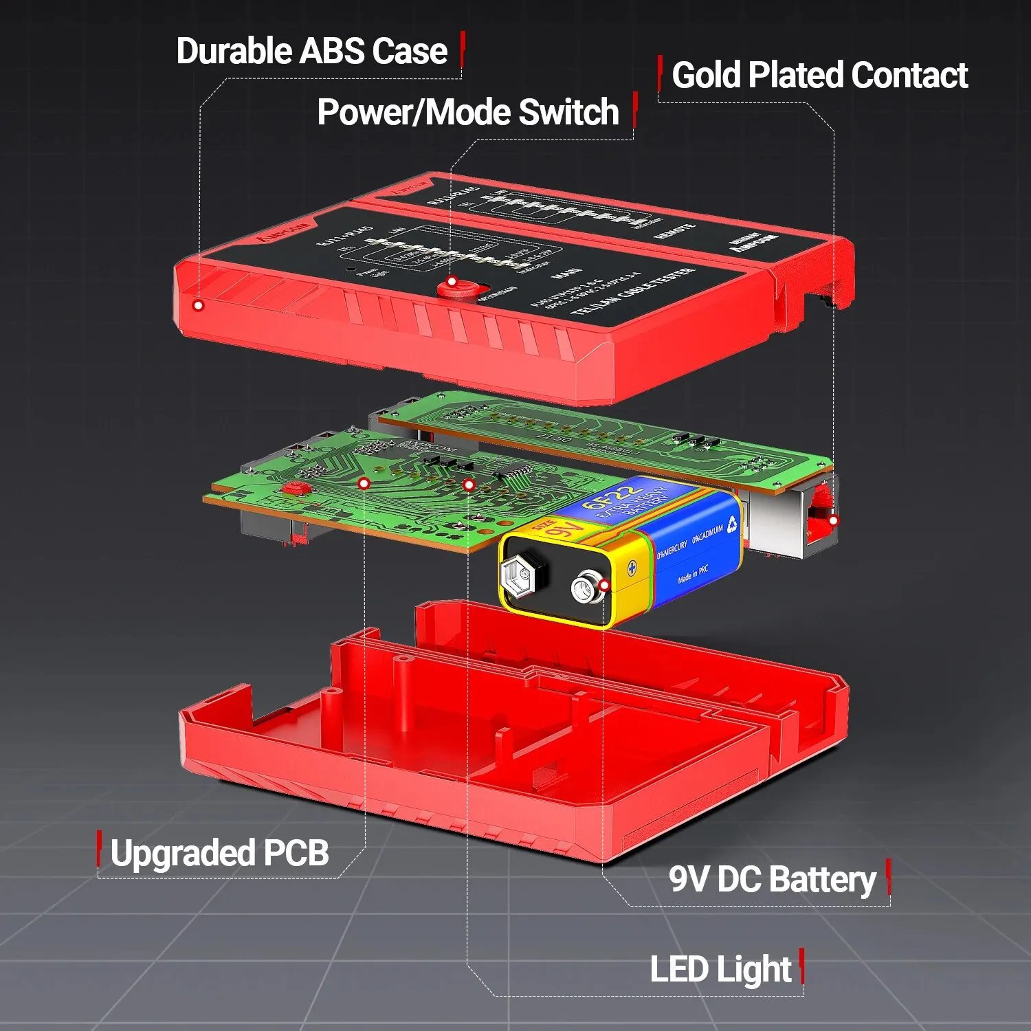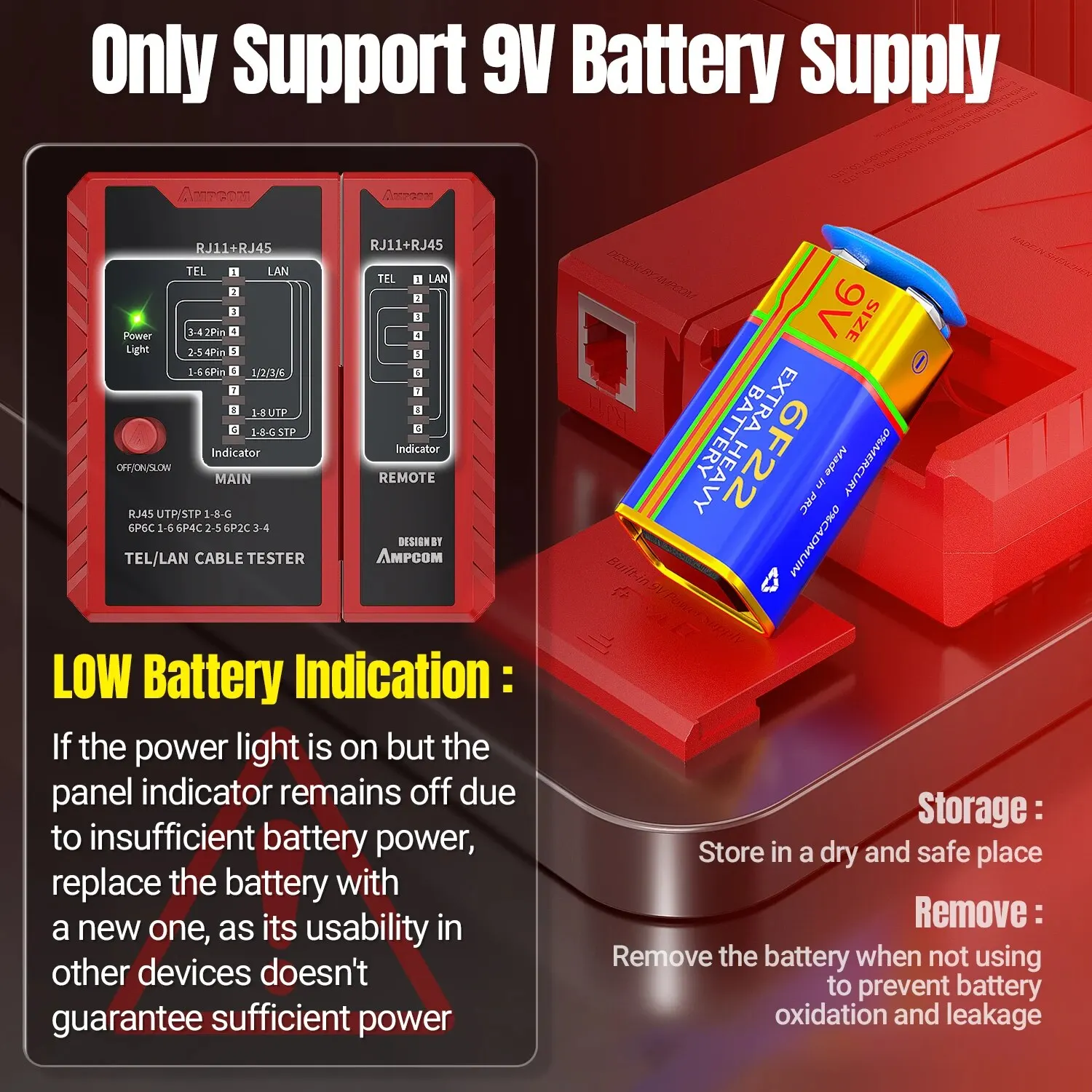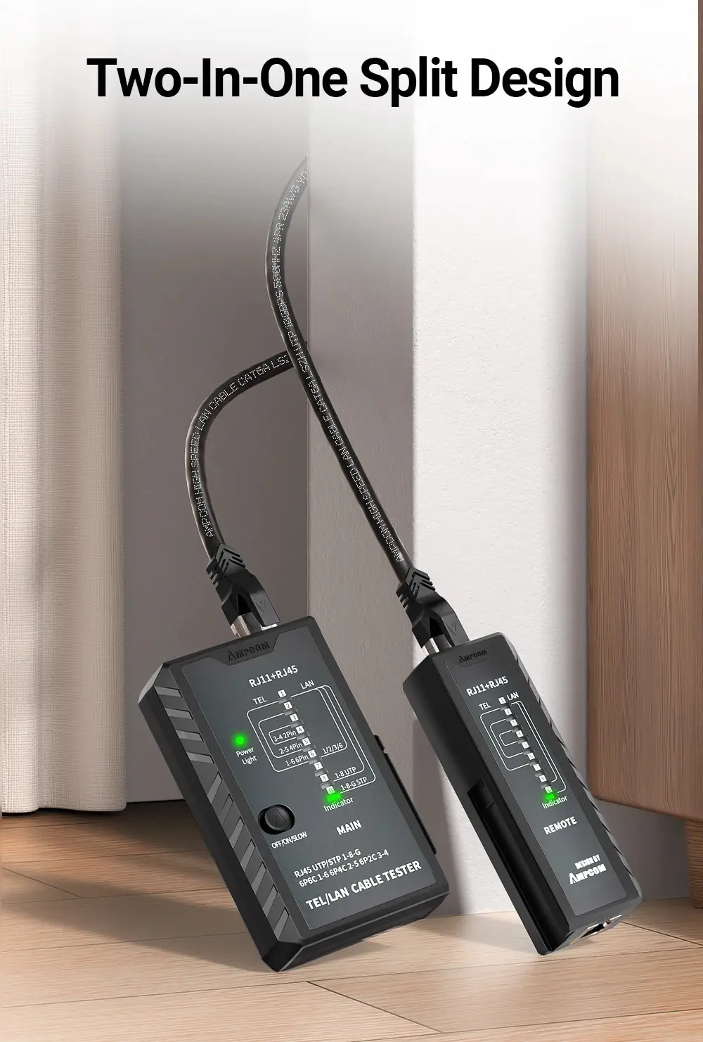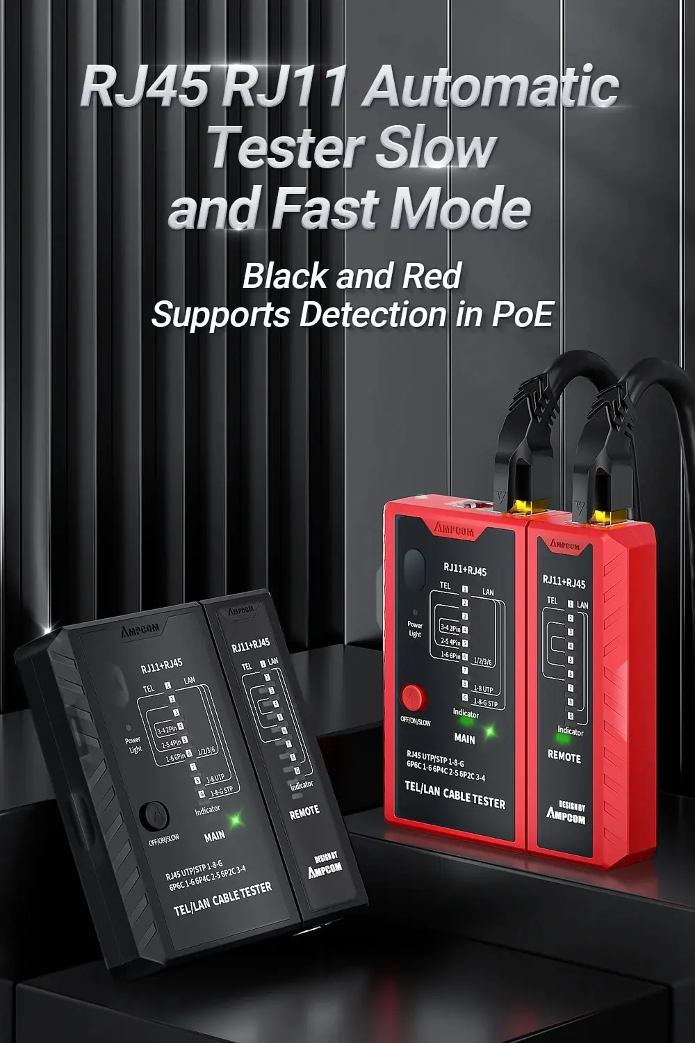 • Probador del cable de Lan del establecimiento de una red RJ45:El probador del cable de la red de AMPCOM se diseña para el Lan del establecimiento de una red RJ45, proporcionando capacidades de prueba completas y exactas para su red.