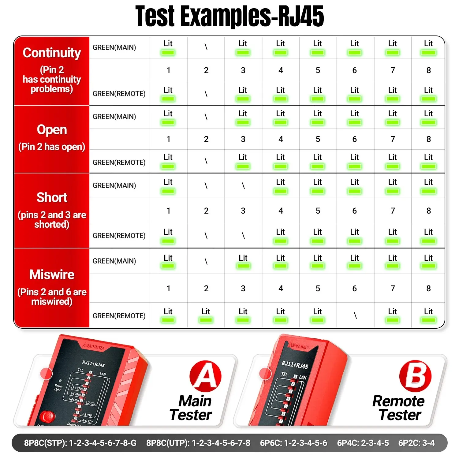 AMPCOM Red de Cable Tester RJ45 RJ11 de Red LAN Ethernet RJ45 Cable Tester herramienta de Reparación de red LAN Herramienta de Red