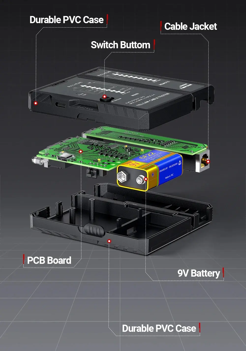 Caso durable del PVC/bettom del interruptor/chaqueta del cable/PCB board/9V batería